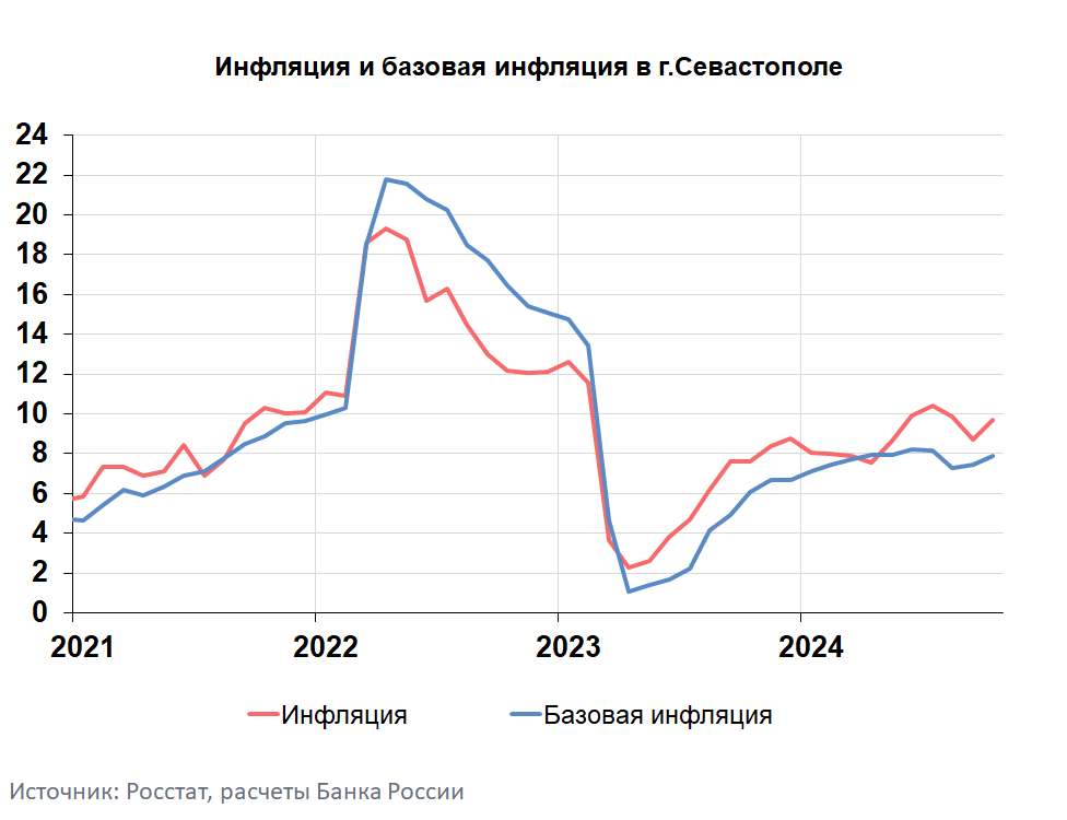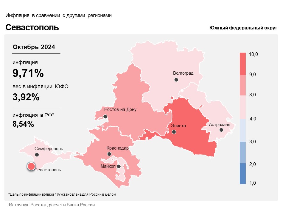 Годовая инфляция в Севастополе в октябре ускорилась на 1,01 п.п. и составила 9,71%. Главным образом это связано с сокращением предложения ряда продовольственных и непродовольственных товаров, ростом затрат производителей и поставщиков товаров и услуг, а также индексацией стоимости проезда в городском транспорте. Инфляция в регионе сложилась выше показателей по Южному федеральному округу (8,26%) и России в целом (8,54%).