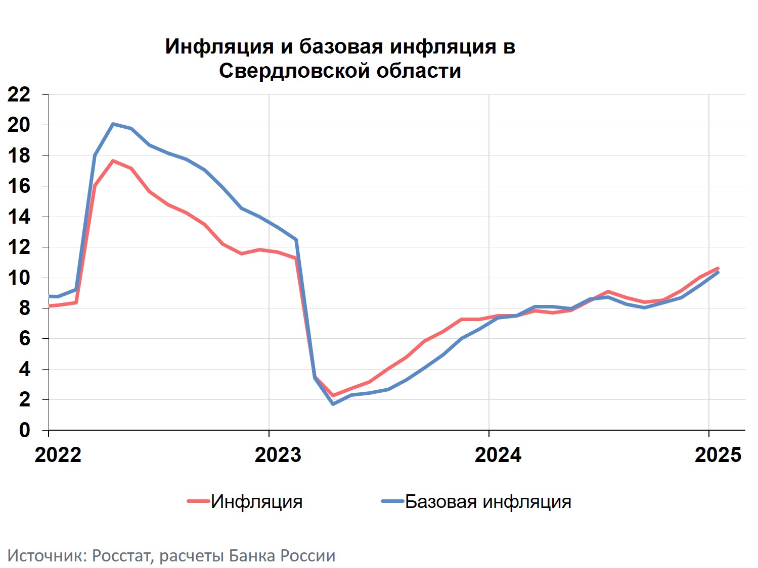 Годовая инфляция в Свердловской области в январе 2025 года увеличилась и составила 10,60% после 10,02% месяцем ранее. Уровень инфляции в области был выше, чем в Уральском федеральном округе (9,32%) и России в целом (9,92%). Основные причины ускорения роста цен в регионе – рост издержек производителей и поставщиков товаров и услуг, а также сокращение предложения отдельных продовольственных товаров.