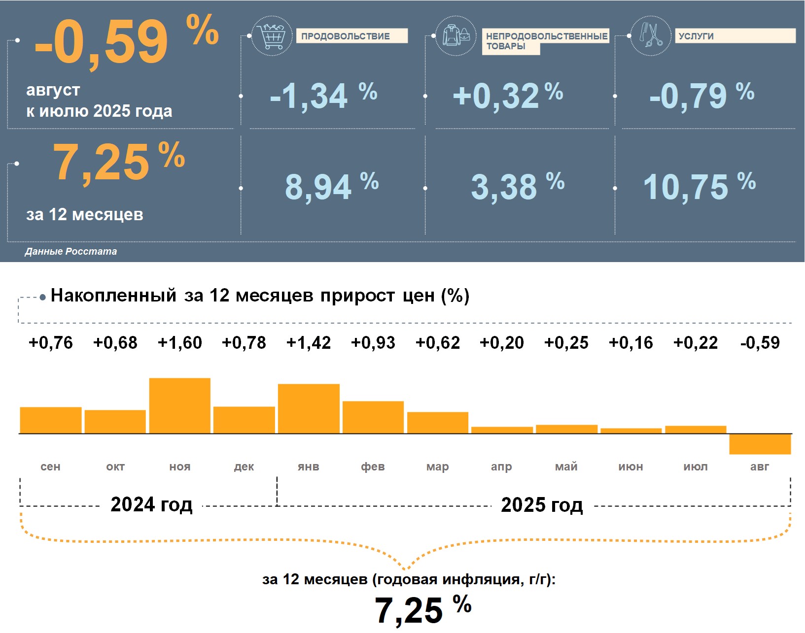 Цены в Архангельской области (без учета НАО) в августе 2025 года, по данным Росстата, снизились на 0,59% к июлю. Годовая инфляция снижается пятый месяц подряд – в августе она составила 7,25%. Это по-прежнему ниже, чем в целом по стране (8,14%).
