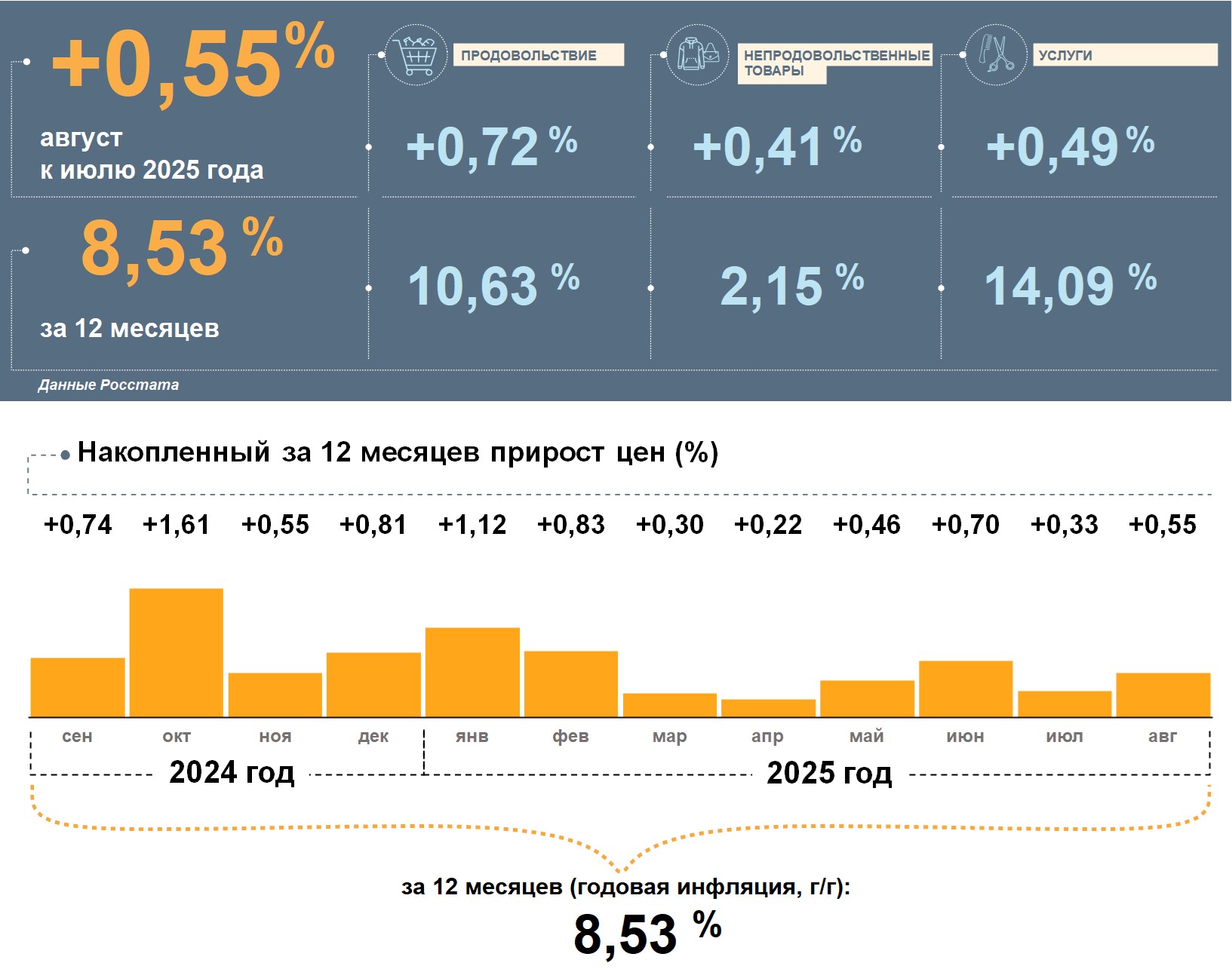 Больше всего в августе подорожали продукты питания. Непродовольственные товары и услуги также заметно выросли в цене. Накопленным итогом за 12 месяцев сильнее всего повысились цены на услуги. Продукты питания за год прибавили в цене больше, чем потребительская корзина в целом, а непродовольственные товары — значительно меньше.