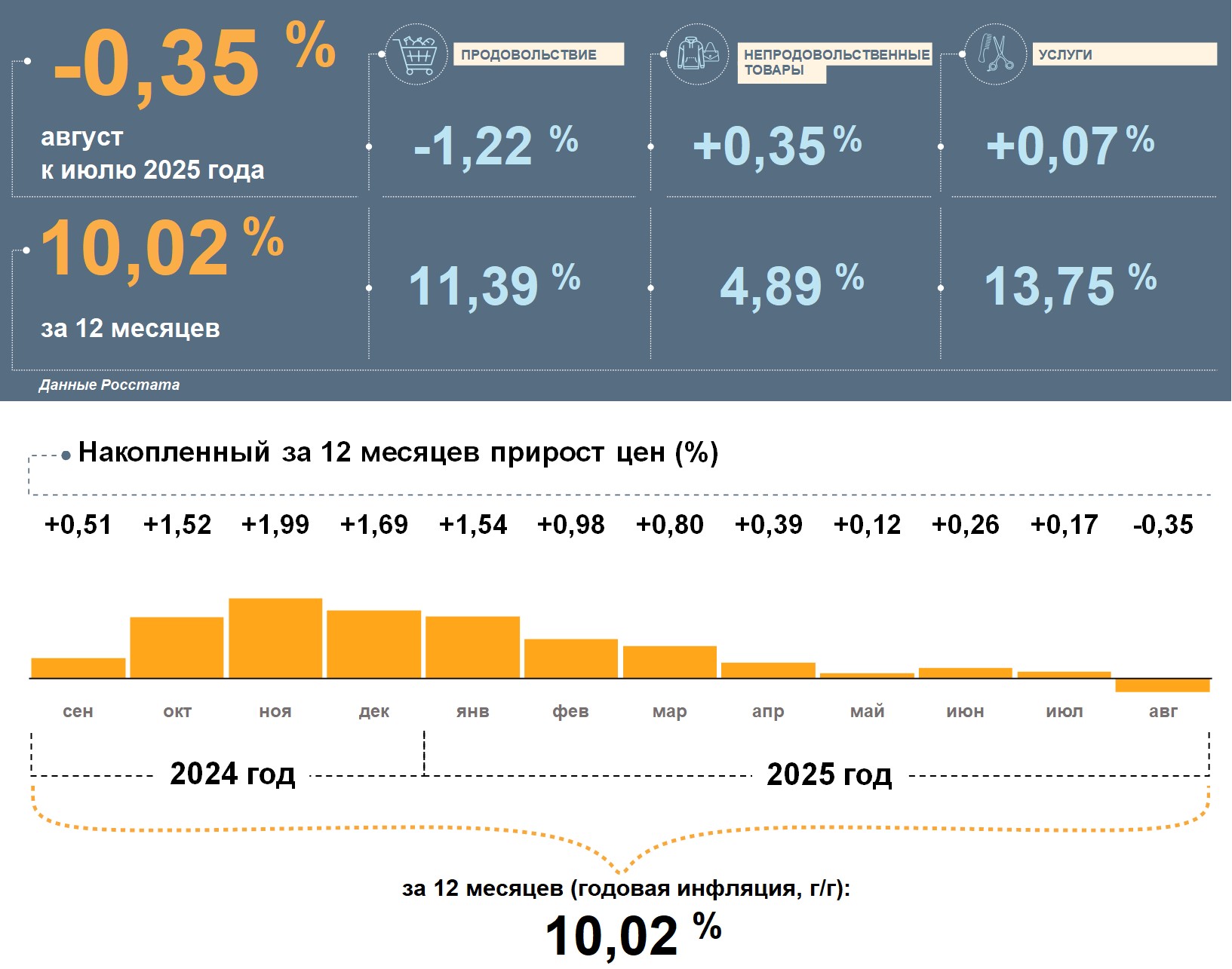 Цены в Чувашской Республике в августе 2025 года, по данным Росстата, снизились на 0,35% к июлю. Годовая инфляция снижалась пятый месяц подряд и составила 10,02%. Это выше, чем в целом по стране (8,14%).