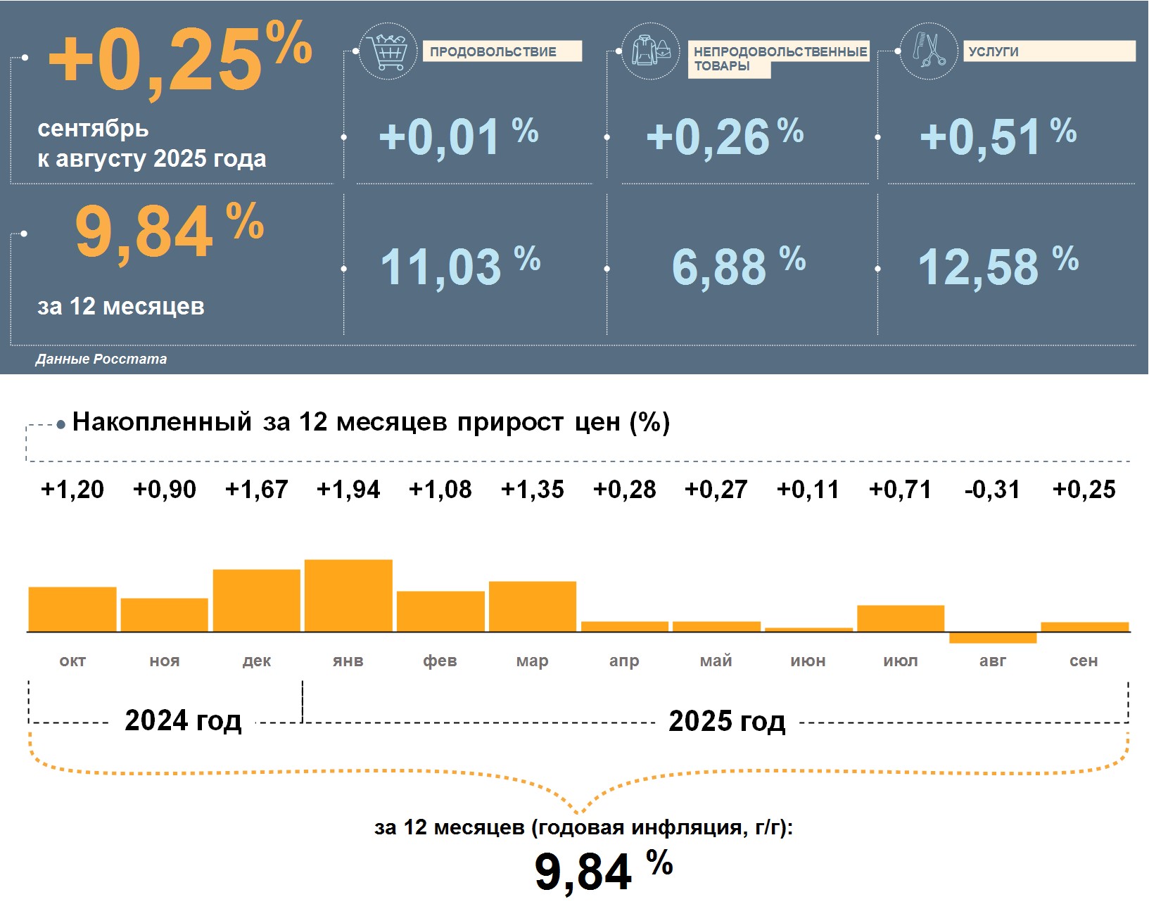 Значительнее всего в сентябре и в целом за год подорожали услуги. Цены на продовольствие за месяц почти не изменились, но за год оно подорожало больше, чем потребительская корзина в целом. Непродовольственные товары в сентябре выросли в цене умеренно, а в целом за 12 месяцев подорожали меньше, чем все товары и услуги.