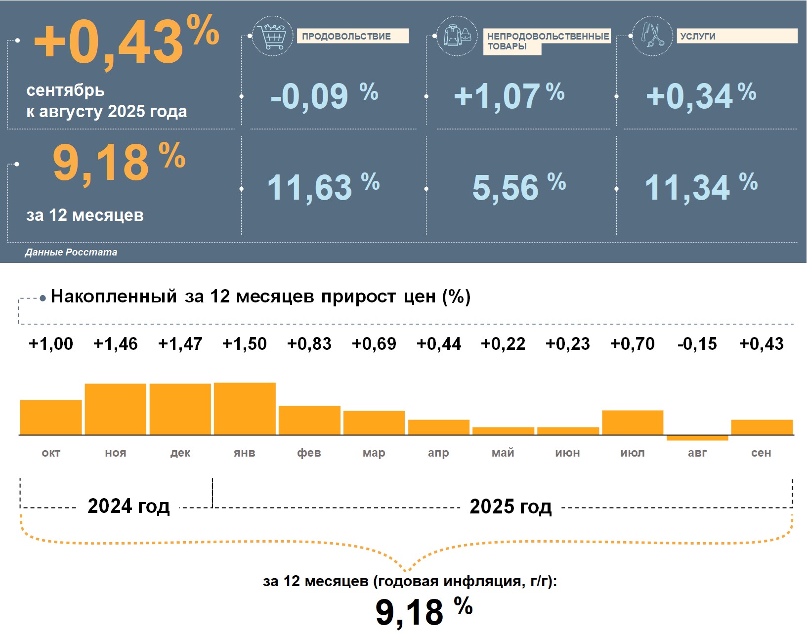 Наиболее заметно в сентябре подорожали непродовольственные товары, но за год рост цен на них был ниже, чем по потребительской корзине в целом. Цены на услуги за месяц росли умеренными темпами, однако, за год они подорожали больше, чем все товары и услуги. Цены на продовольствие, напротив, снизились за сентябрь, а за год они повысились больше, чем на всю потребительскую корзину.
