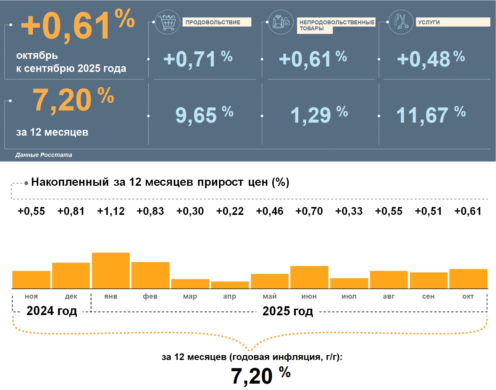 Больше всего в октябре подорожало продовольствие. Непродовольственные товары и услуги заметно выросли в цене. Накопленным итогом за 12 месяцев сильнее всего повысились цены на услуги. Продукты питания за год прибавили в цене больше, чем потребительская корзина в целом, а непродовольственные товары — значительно меньше.