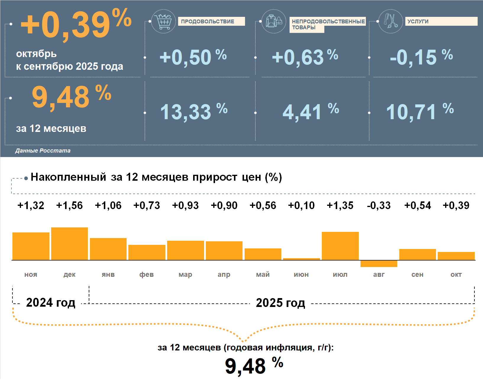 Цены в Республике Бурятия в октябре 2025 года, по данным Росстата, выросли на 0,39% к сентябрю. Годовая инфляция снизилась и составила 9,48%. Она осталась выше, чем в целом по стране (7,71%).