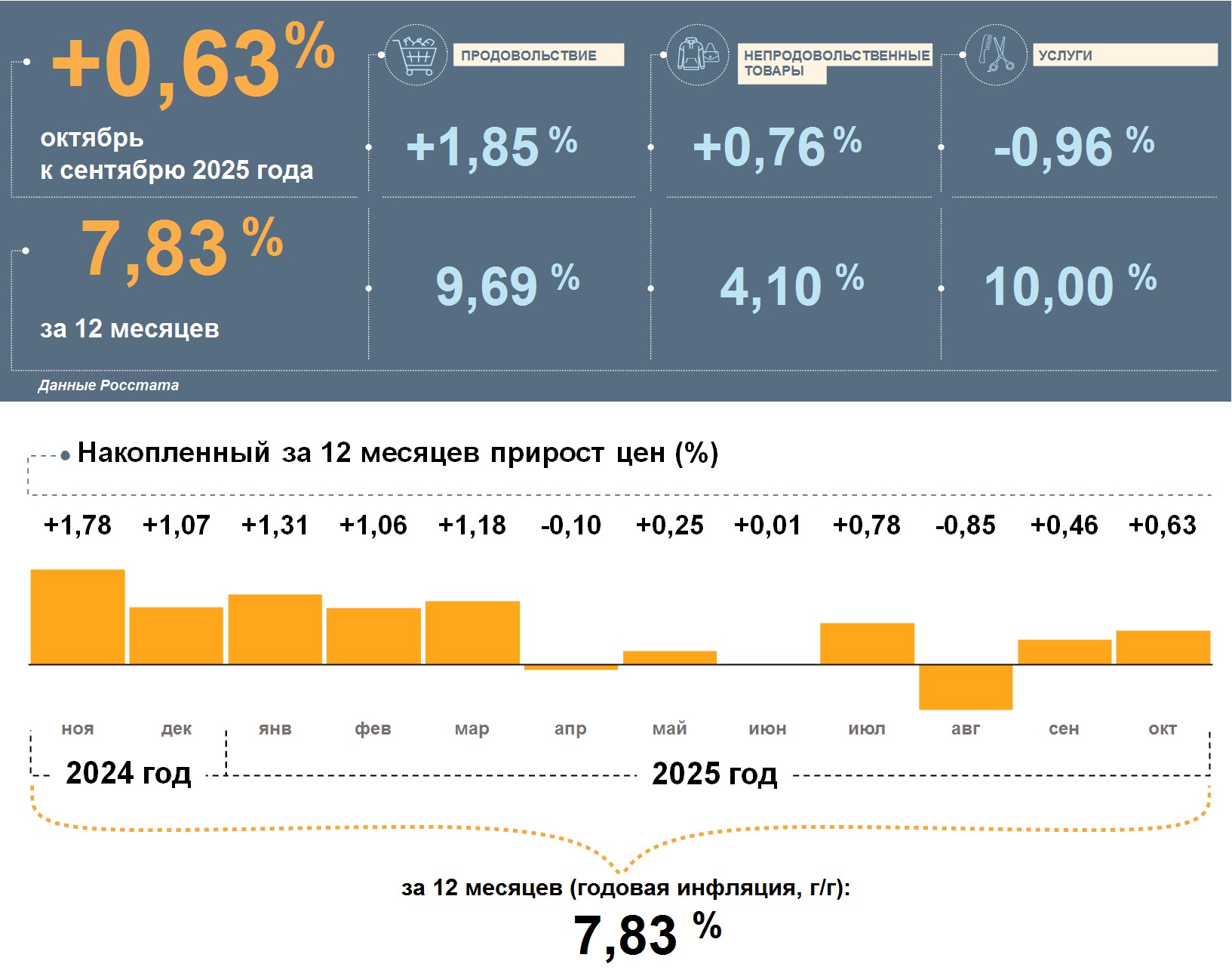 Цены в Республике Коми в октябре 2025 года, по данным Росстата, выросли по сравнению с сентябрем на 0,63%. Годовая инфляция при этом замедлилась и составила 7,83%. Это выше, чем в целом по стране (7,71%).
