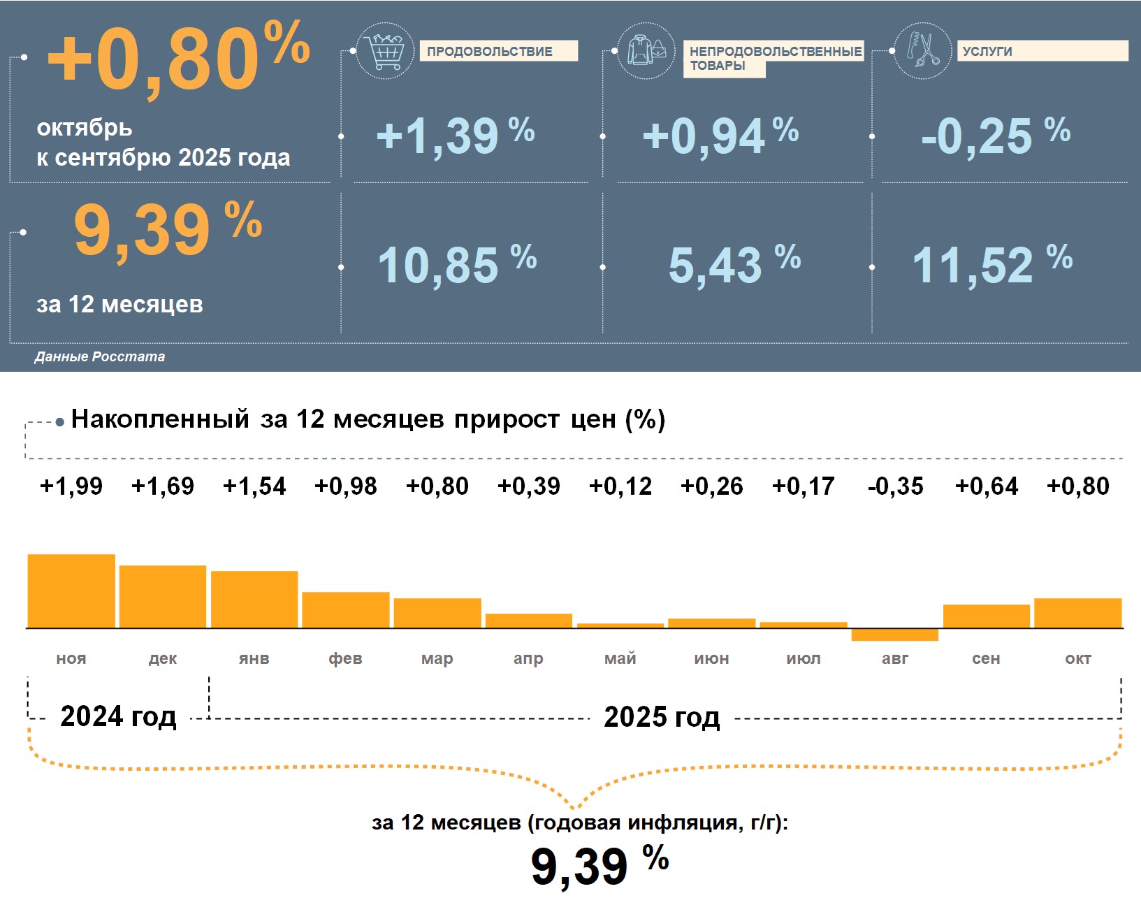 Цены в Чувашской Республике в октябре 2025 года, по данным Росстата, выросли на 0,80% к сентябрю. Годовая инфляция снизилась и составила 9,39%. Это выше, чем в целом по стране (7,71%).