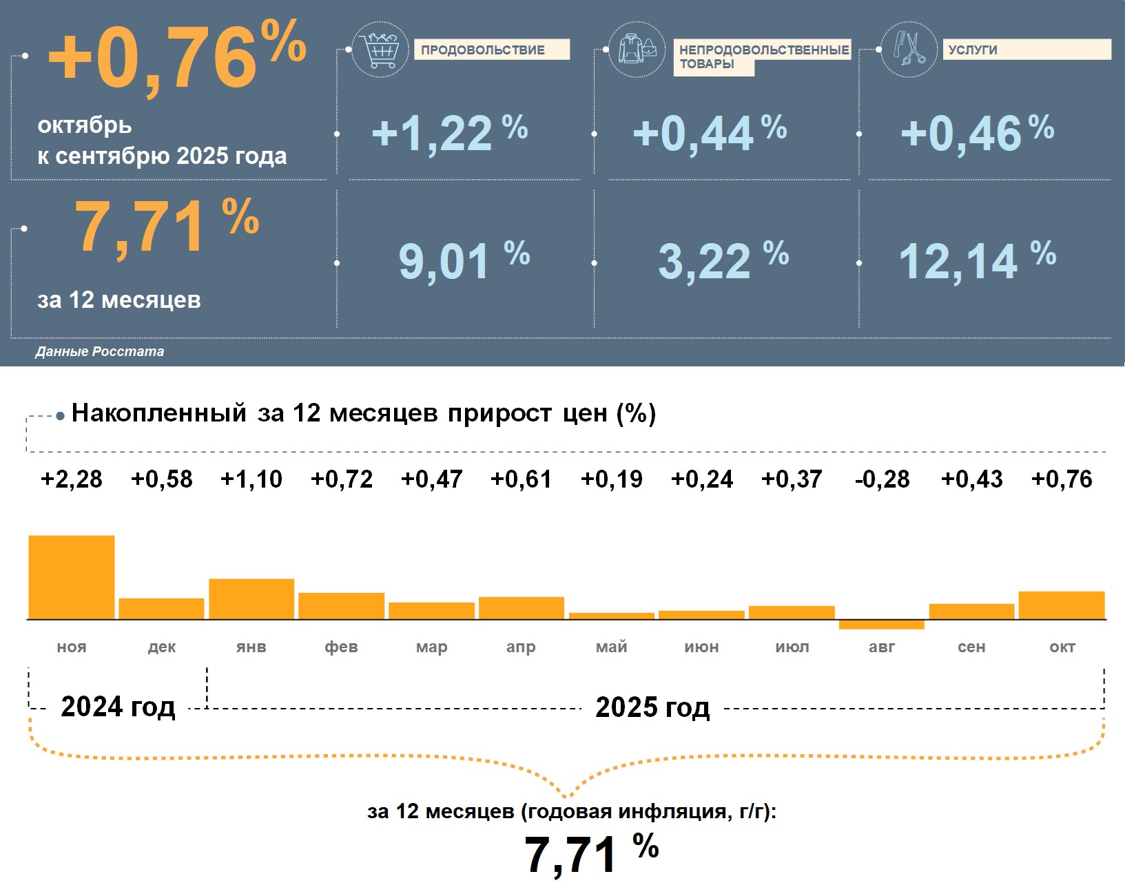 Цены в Волгоградской области в октябре 2025 года, по данным Росстата, выросли на 0,76% к сентябрю. Годовая инфляция в регионе снизилась и составила 7,71%, как и в целом по стране.