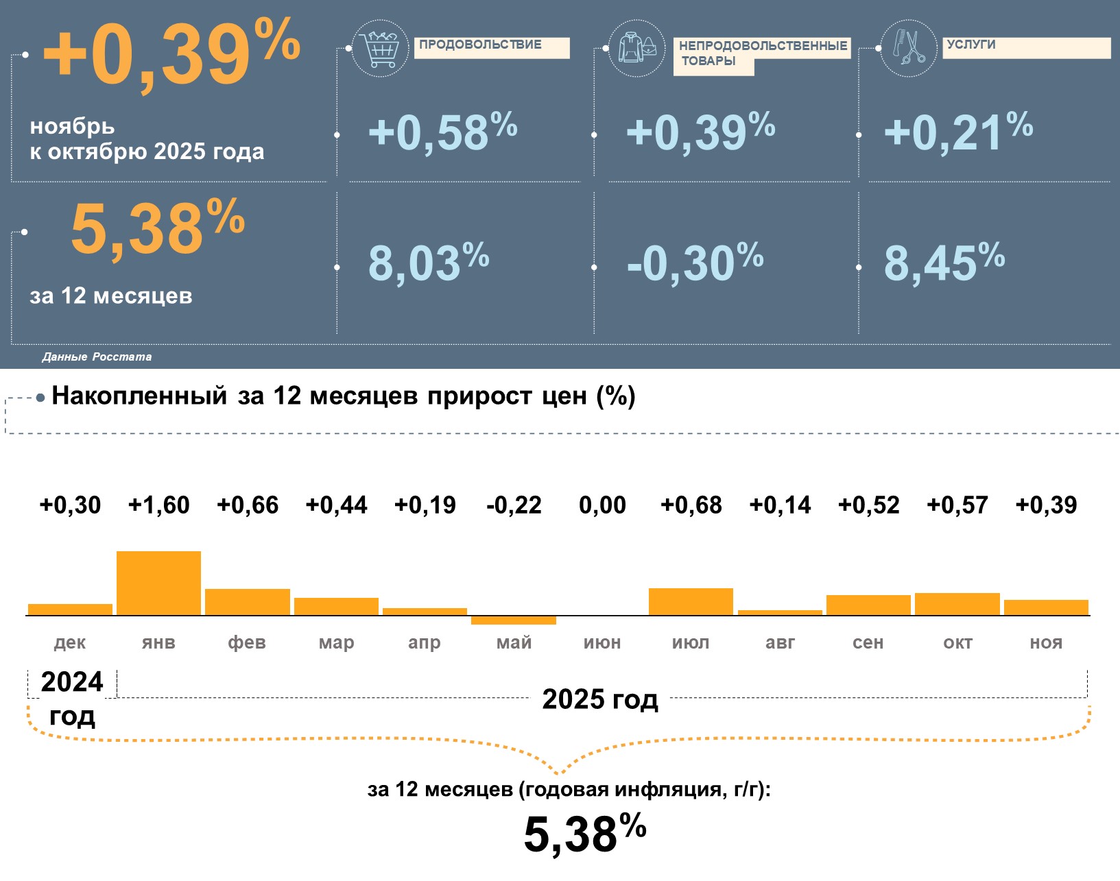 Цены в Хабаровском крае в ноябре 2025 года, по данным Росстата, выросли на 0,39% по отношению к октябрю. Годовая инфляция в регионе замедлялась восьмой месяц подряд и составила 5,38%. Это ниже, чем в целом по стране (6,64%).