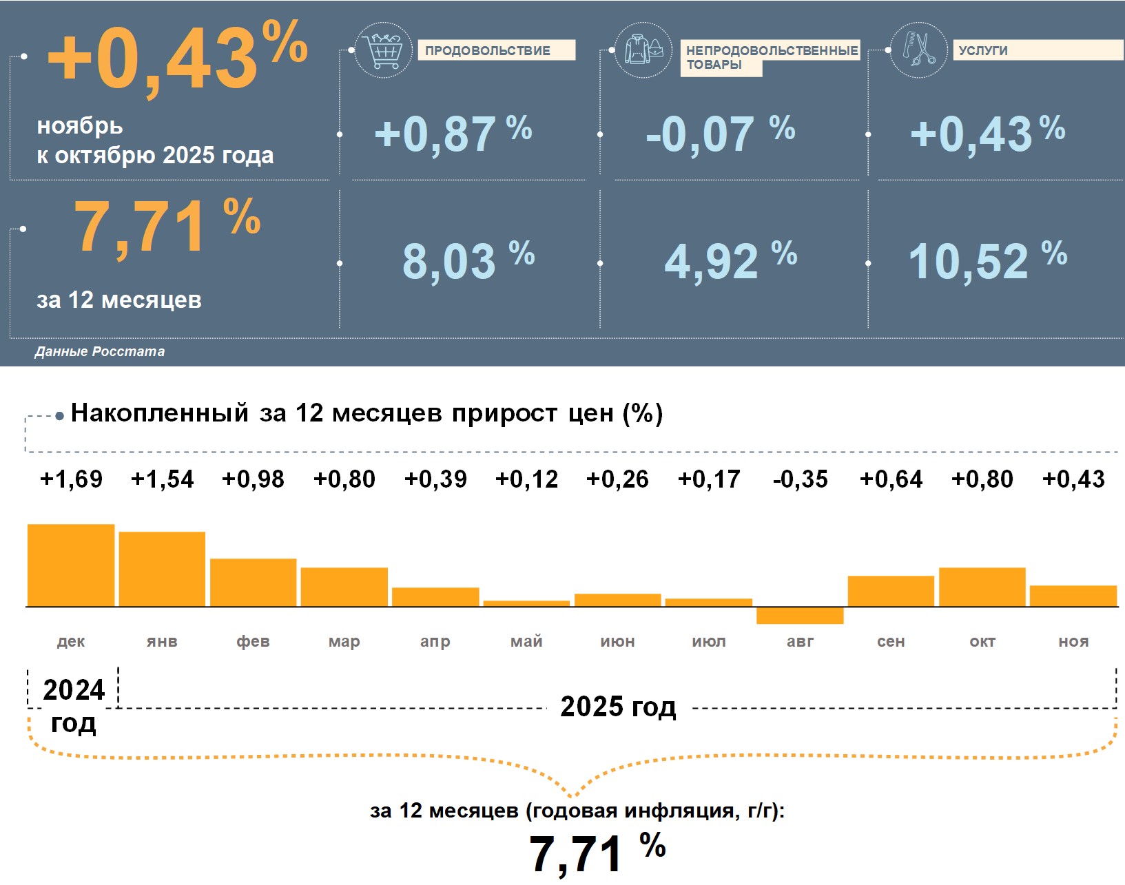 Цены в Чувашской Республике в ноябре 2025 года, по данным Росстата, выросли на 0,43%. Годовая инфляция продолжила снижаться и составила 7,71%. Это выше, чем в целом по стране (6,64%).
