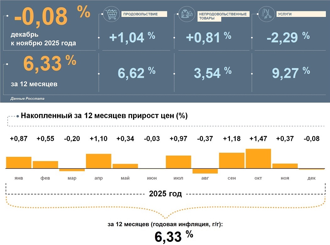 Цены в Магаданской области в декабре 2025 года, по данным Росстата, снизились на 0,08% по отношению к ноябрю. Годовая инфляция замедлилась и составила 6,33%. Это больше, чем в целом по стране (5,59%).