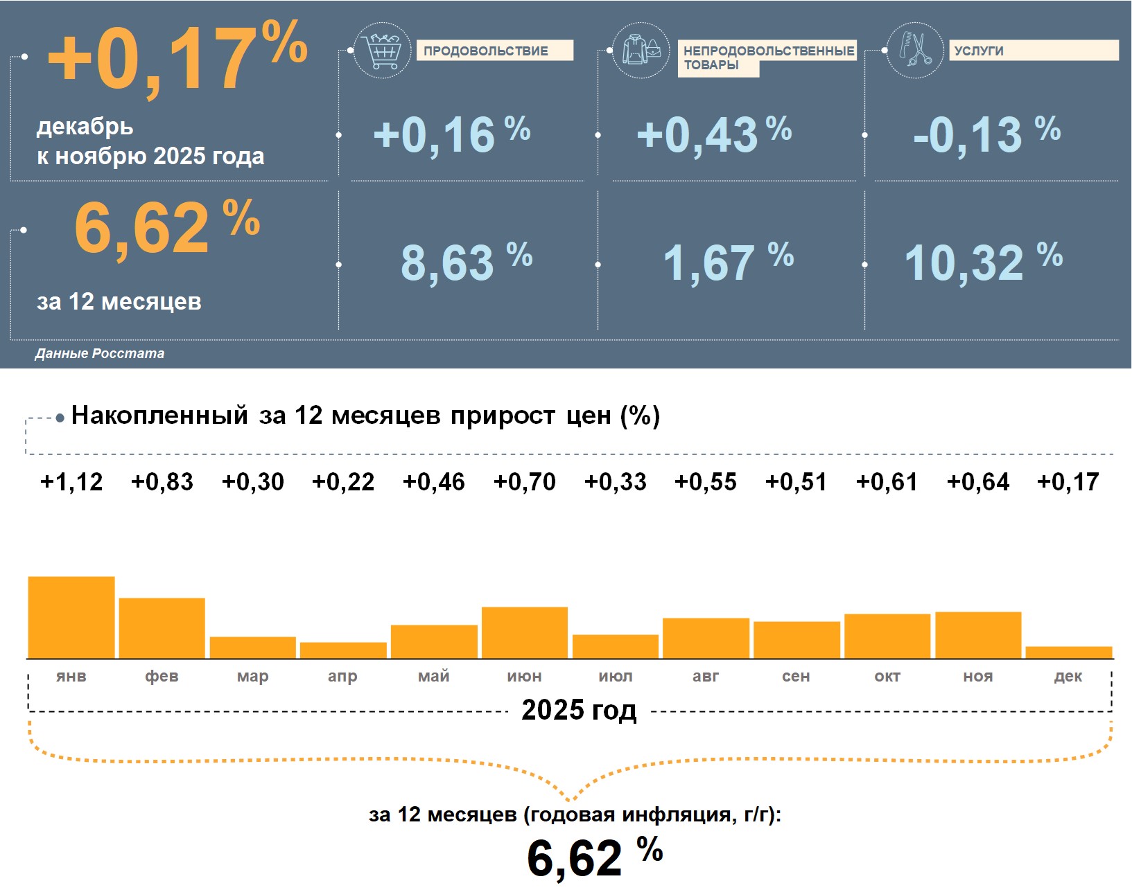 Цены в Приморском крае в декабре 2025 года, по данным Росстата, выросли на 0,17% по отношению к ноябрю. Годовая инфляция замедлилась и составила 6,62%. Это больше, чем в целом по стране (5,59%).