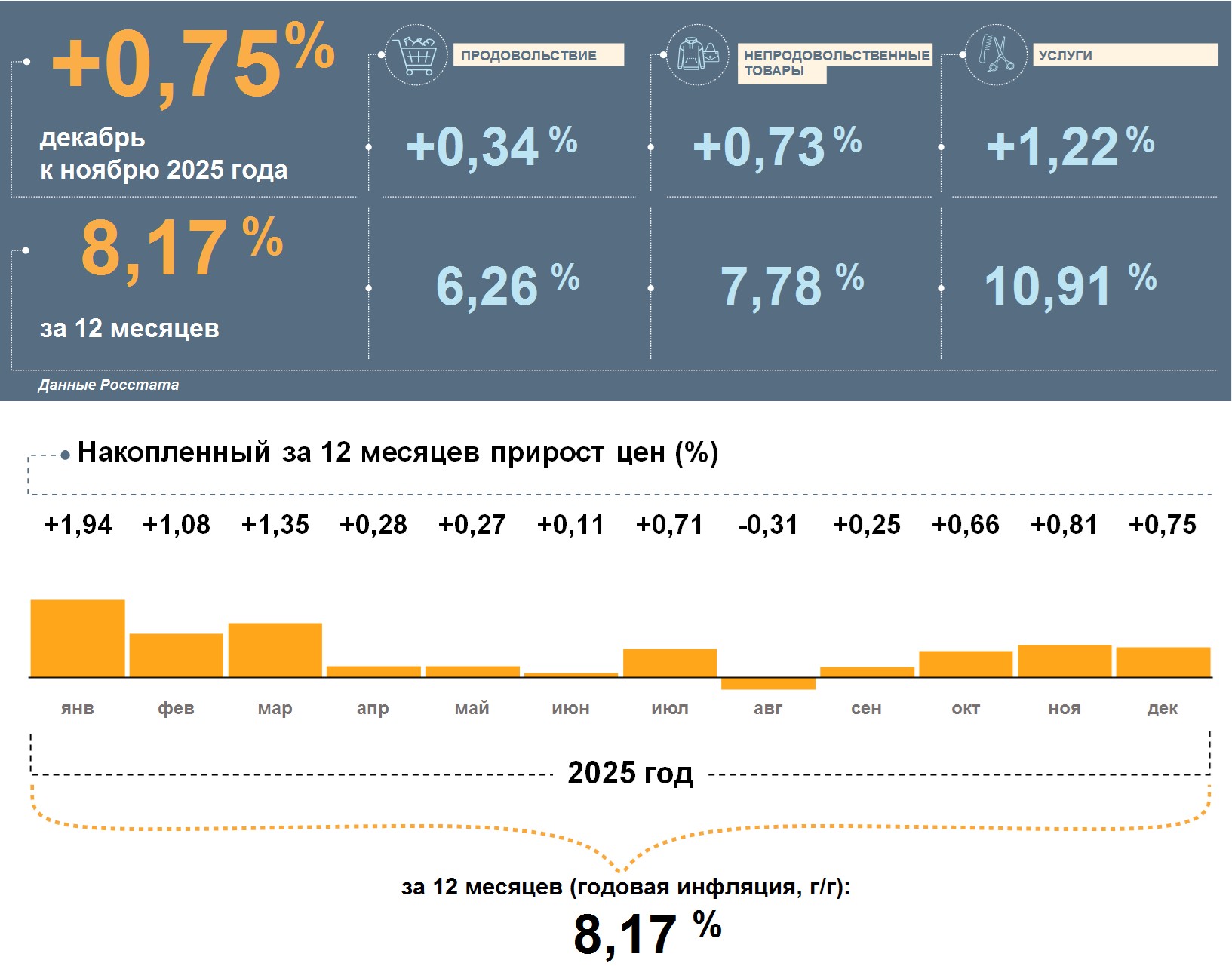 Цены в Мурманской области в декабре 2025 года, по данным Росстата, выросли на 0,75% к ноябрю. Годовая инфляция замедлилась и составила 8,17%. Это выше, чем в целом по стране (5,59%).