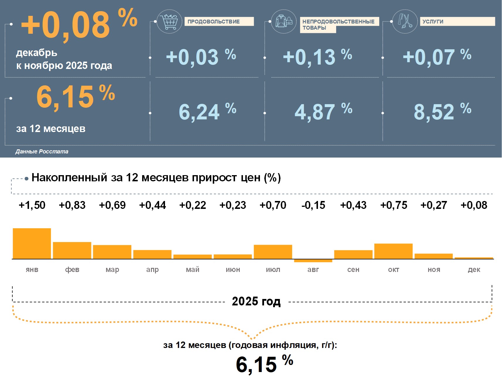 Цены в Курской области в декабре 2025 года, по данным Росстата, выросли на 0,08% к ноябрю. Годовая инфляция замедлилась и составила 6,15%. Но это выше, чем в целом по стране (5,59%).