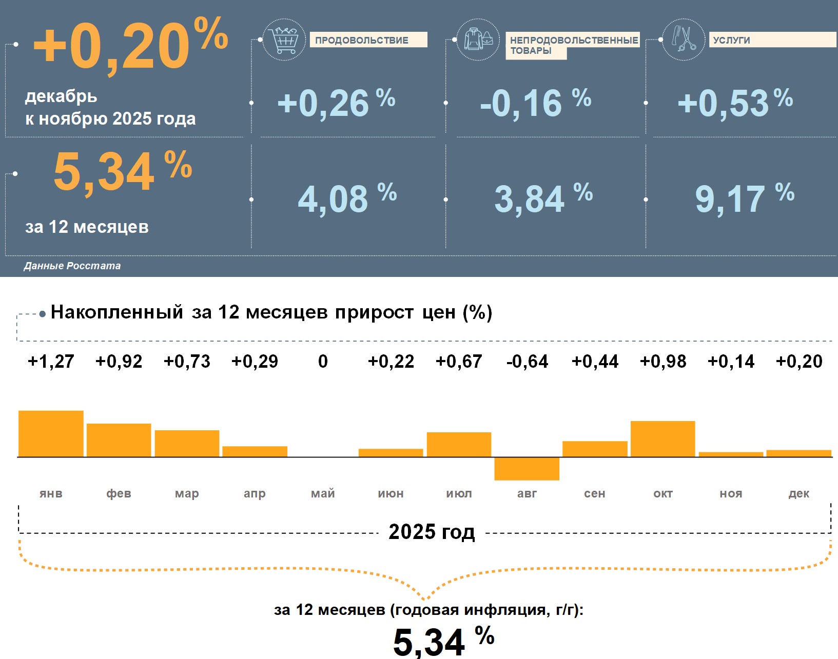 В декабре цены на продовольствие и услуги выросли, а непродовольственные товары подешевели. В целом за год цены на услуги увеличились больше, чем на всю потребительскую корзину, в то время как продовольствие и непродовольственные товары за 12 месяцев подорожали меньше, чем все товары и услуги.