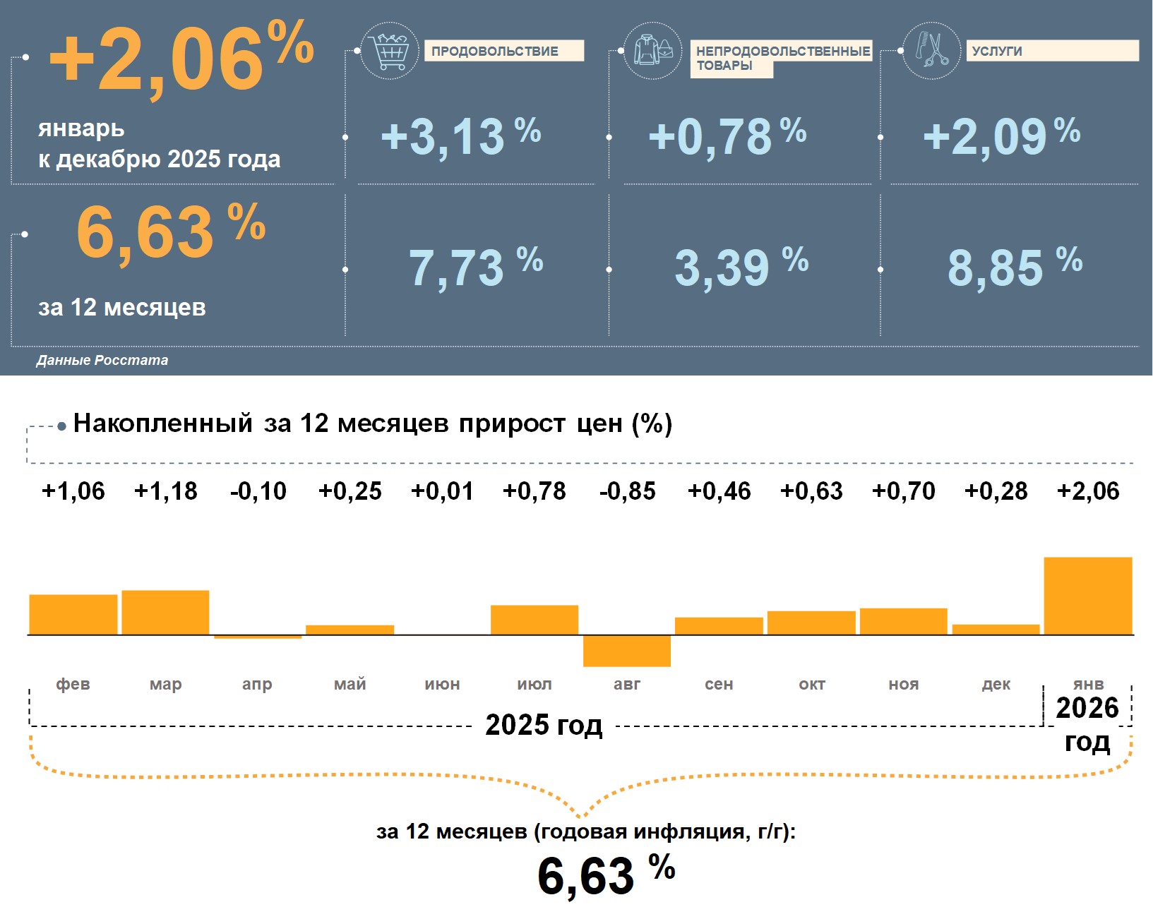 По данным Росстата, после длительного снижения годовая инфляция в России в январе 2026 года ожидаемо повысилась. Однако это не разворот тренда, а результат влияния разовых факторов. После их исчерпания инфляция вновь замедлится. По прогнозу Банка России, в 2026 году она снизится до 4,5–5,5%, а в 2027 году и в дальнейшем будет находиться на цели вблизи 4%.