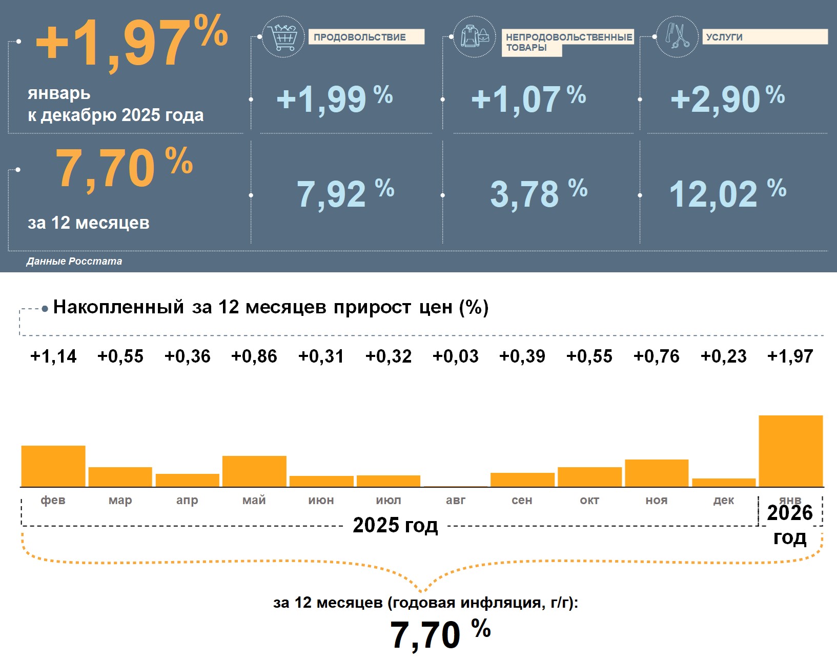Цены в Новгородской области в январе 2026 года, по данным Росстата, выросли на 1,97% к декабрю 2025 года. Годовая инфляция повысилась и составила 7,70%. Это выше, чем в целом по стране (6,00%).