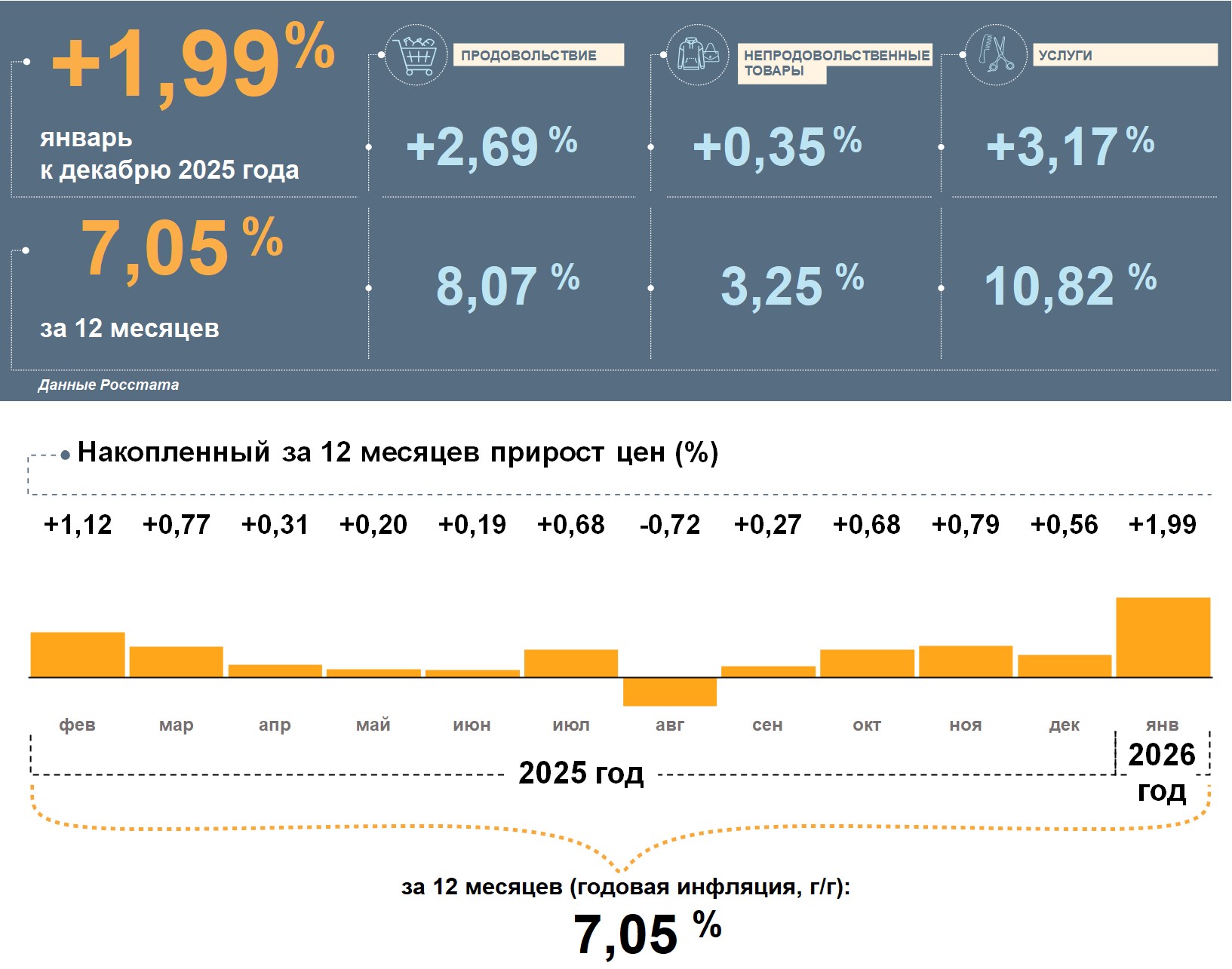 Цены в Оренбургской области в январе 2026 года, по данным Росстата, выросли на 1,99% к декабрю 2025 года. Годовая инфляция повысилась и составила 7,05%. Это выше, чем в целом по стране (6,00%).