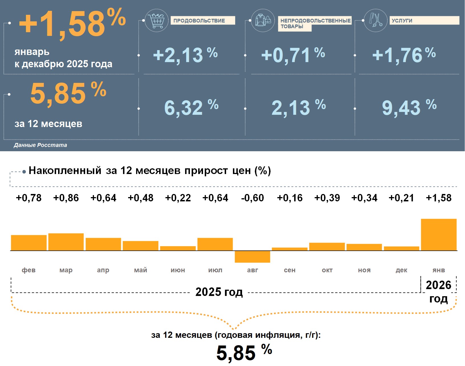 Цены в Краснодарском крае в январе 2026 года, по данным Росстата, выросли на 1,58% к декабрю 2025 года. Годовая инфляция ускорилась и составила 5,85%. Это немного ниже, чем в целом по стране (6,00%).