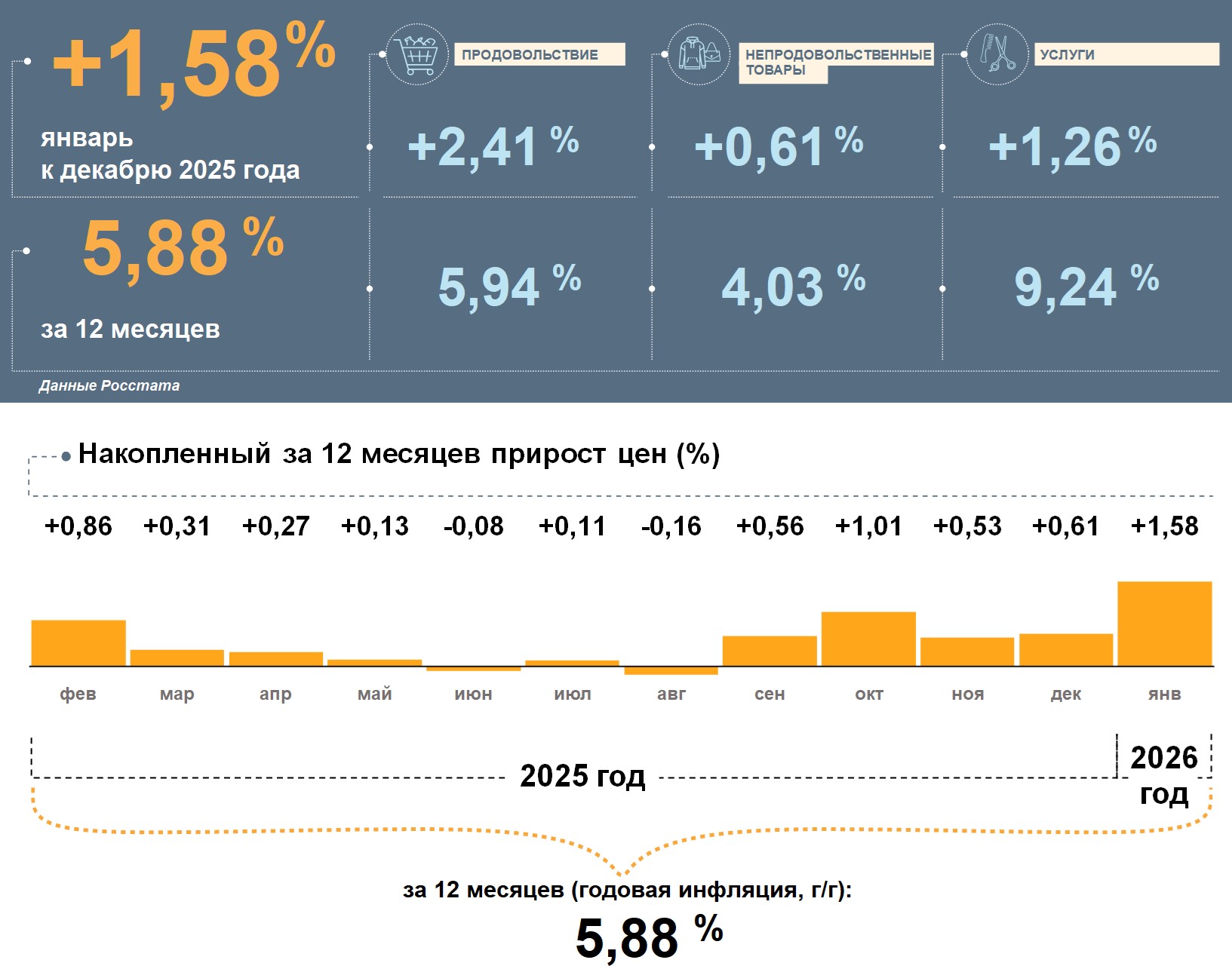 Цены в Республике Калмыкия в январе 2026 года, по данным Росстата, выросли на 1,58% к декабрю 2025 года. Годовая инфляция повысилась и составила 5,88%. Это ниже, чем в целом по стране (6,00%).