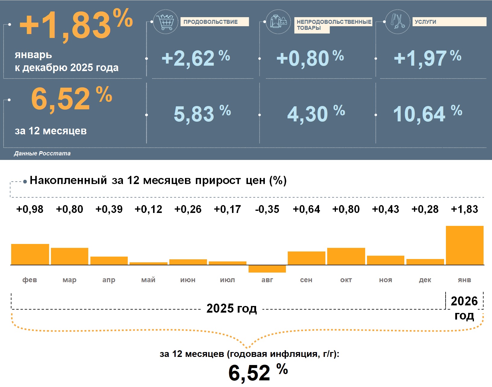 Цены в Чувашской Республике в январе 2026 года, по данным Росстата, выросли на 1,83% к предыдущему месяцу. Годовая инфляция увеличилась до 6,52%. Это выше, чем в целом по стране (6,00%).