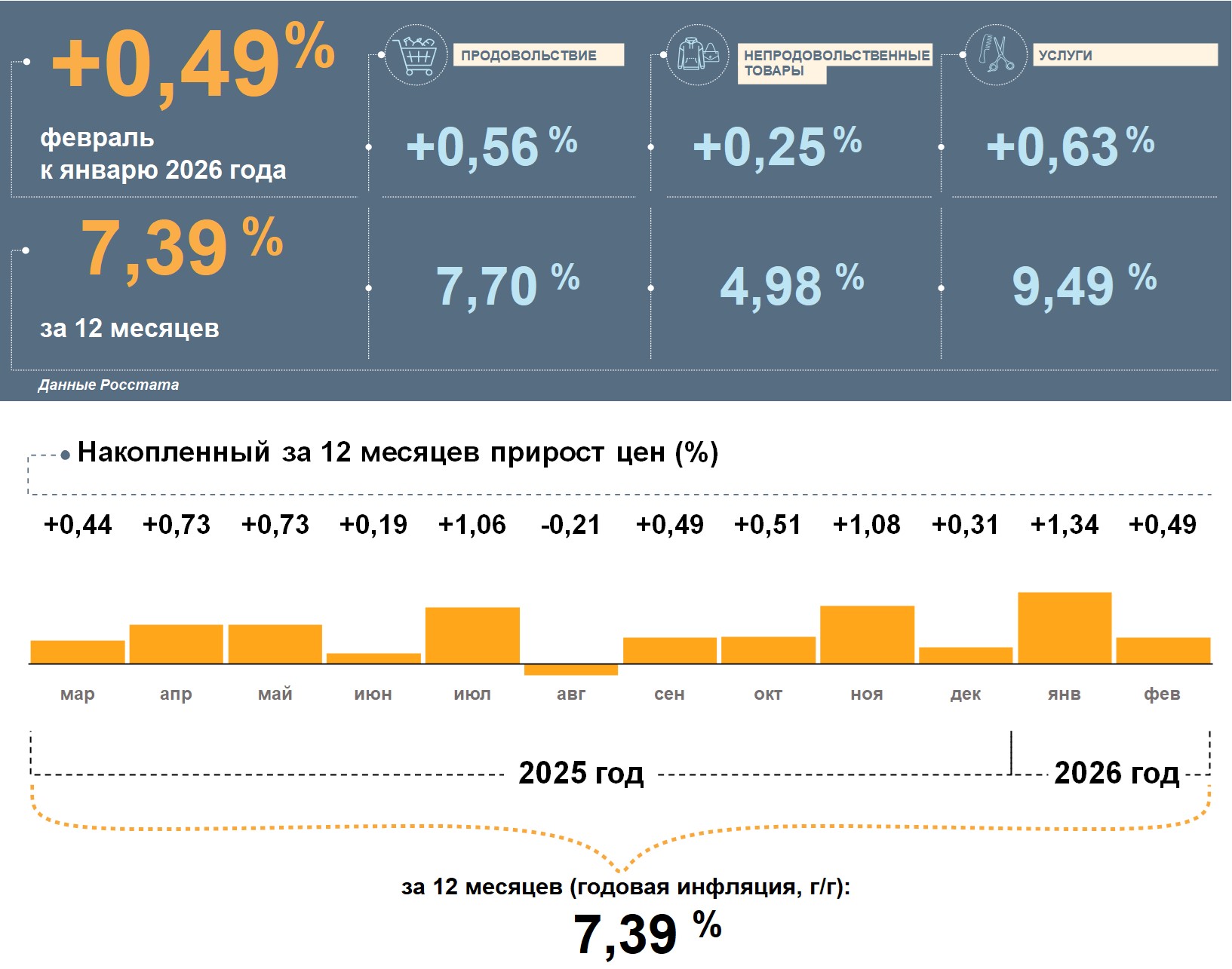 Больше всего в феврале подорожали услуги, немного меньше — продукты питания. Непродовольственные товары подорожали умеренно. Накопленным итогом за 12 месяцев цены на услуги и продукты питания выросли больше, чем на потребительскую корзину в целом, а на непродовольственные товары — меньше.