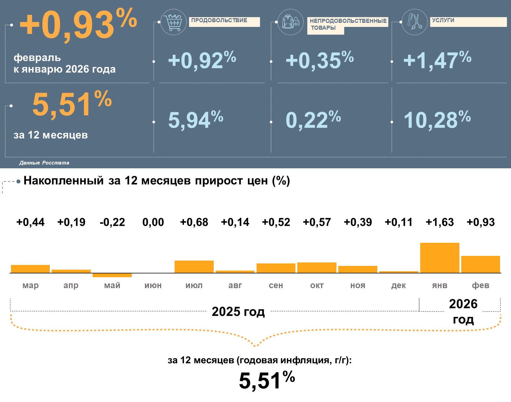 В феврале больше всего подорожали услуги. Продукты питания значимо выросли в цене, непродовольственные товары — умеренно. Накопленным итогом за 12 месяцев сильнее всего увеличились цены на услуги. Меньше прибавили в цене продукты питания, а непродовольственные товары подорожали незначительно.