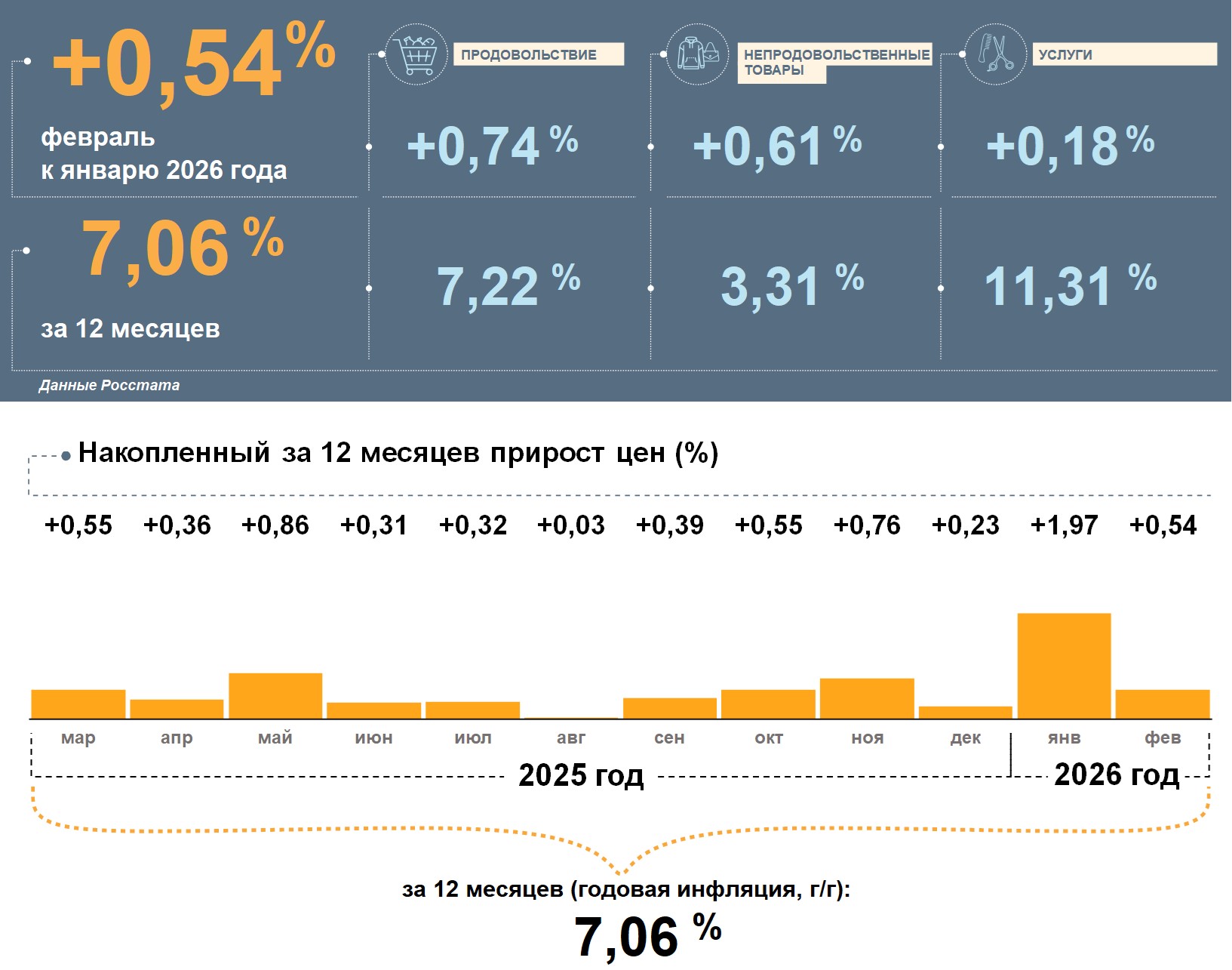 Годовая инфляция в России в феврале ожидаемо замедлилась. По данным Росстата, она составила 5,91%. Влияние разовых факторов, которые ускорили рост цен в январе, значительно уменьшилось. По прогнозу Банка России, с учетом решений по денежно-кредитной политике инфляция в 2026 году снизится до 4,5–5,5%, а в 2027 году и в дальнейшем будет находиться на цели вблизи 4%.