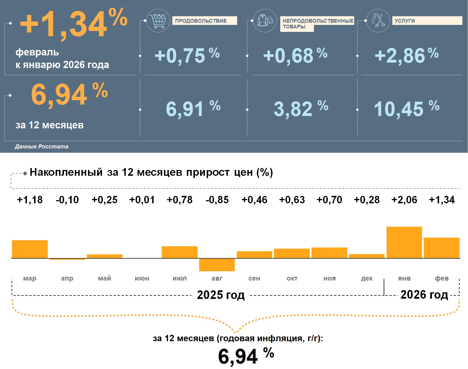 Годовая инфляция в России в феврале ожидаемо замедлилась. По данным Росстата, она составила 5,91%. Влияние разовых факторов, которые ускорили рост цен в январе, значительно уменьшилось. По прогнозу Банка России, с учетом решений по денежно-кредитной политике инфляция в 2026 году снизится до 4,5–5,5%, а в 2027 году и в дальнейшем будет находиться на цели вблизи 4%.