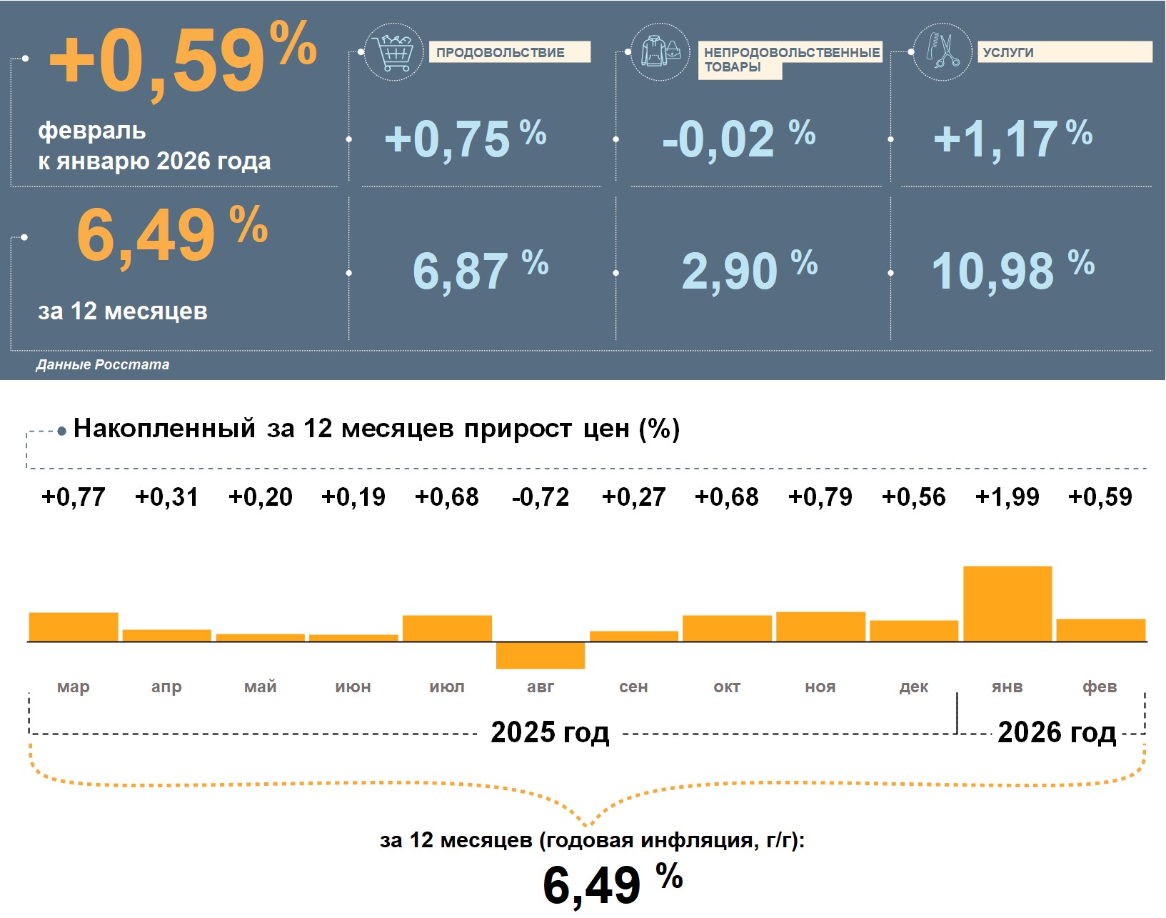 Цены в Оренбургской области в феврале 2026 года, по данным Росстата, выросли на 0,59% к январю. Годовая инфляция замедлилась и составила 6,49%. Это выше, чем в целом по стране (5,91%).