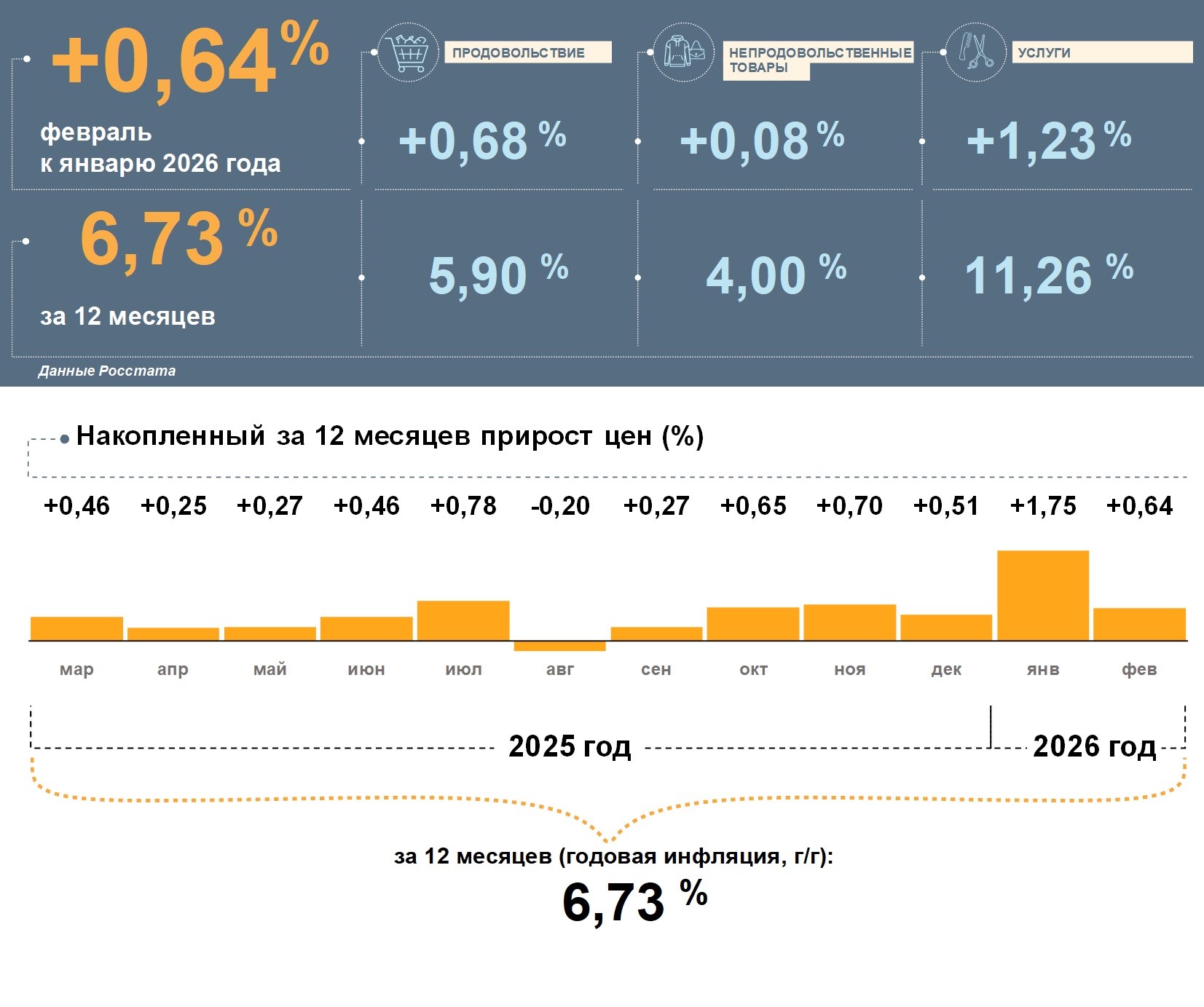 Цены в Пермском крае в феврале 2026 года, по данным Росстата, выросли на 0,64% к январю. Годовая инфляция снизилась и составила 6,73%. Это выше, чем в целом по стране (5,91%).