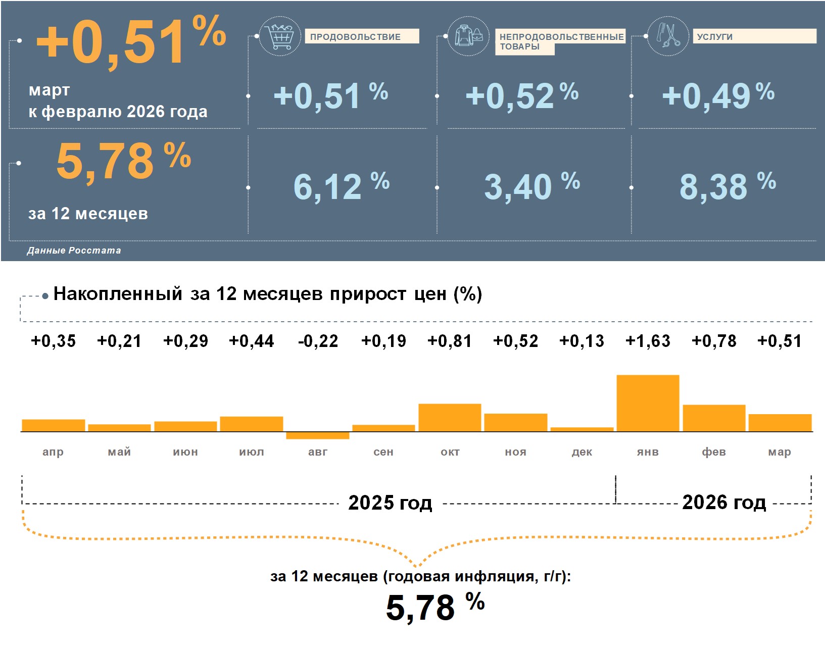 В марте продовольственные и непродовольственные товары, услуги подорожали практически одинаково. Накопленным итогом за 12 месяцев продукты питания и услуги подорожали больше, чем потребительская корзина в целом, а непродовольственные товары — умеренно.