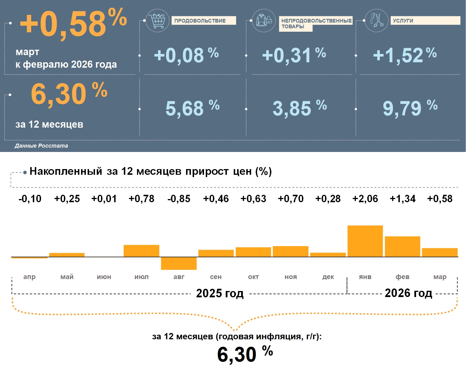 Цены в Республике Коми в марте 2026 года, по данным Росстата, выросли по сравнению с февралем 2026 года на 0,58%. Годовая инфляция при этом замедлилась и составила 6,30%. Это выше, чем в целом по стране (5,86%).