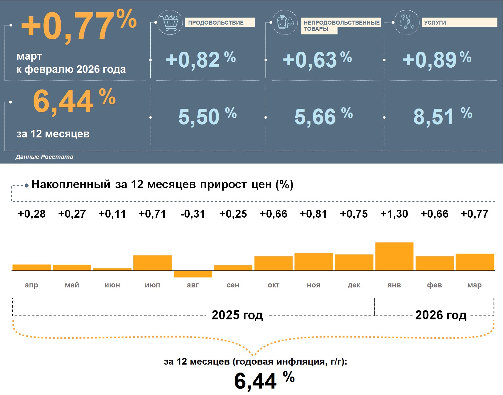 Цены в Мурманской области в марте 2026 года, по данным Росстата, выросли на 0,77% к февралю. Годовая инфляция замедлилась и составила 6,44%. Это выше, чем в целом по стране (5,86%).
