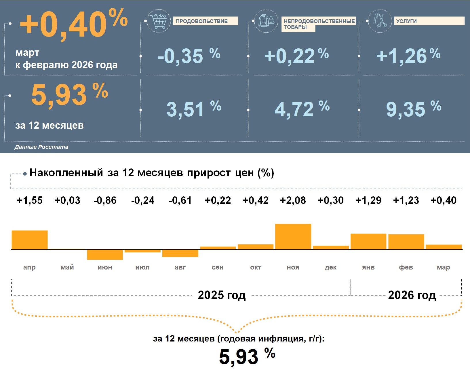 В марте продовольствие подешевело, а в целом за 12 месяцев оно подорожало умеренно. Цены на непродовольственные товары за месяц повысились не очень сильно. А за год их стоимость увеличилась меньше, чем потребительская корзина в целом. Услуги выросли в цене сильнее всего как за месяц, так и в целом за год.