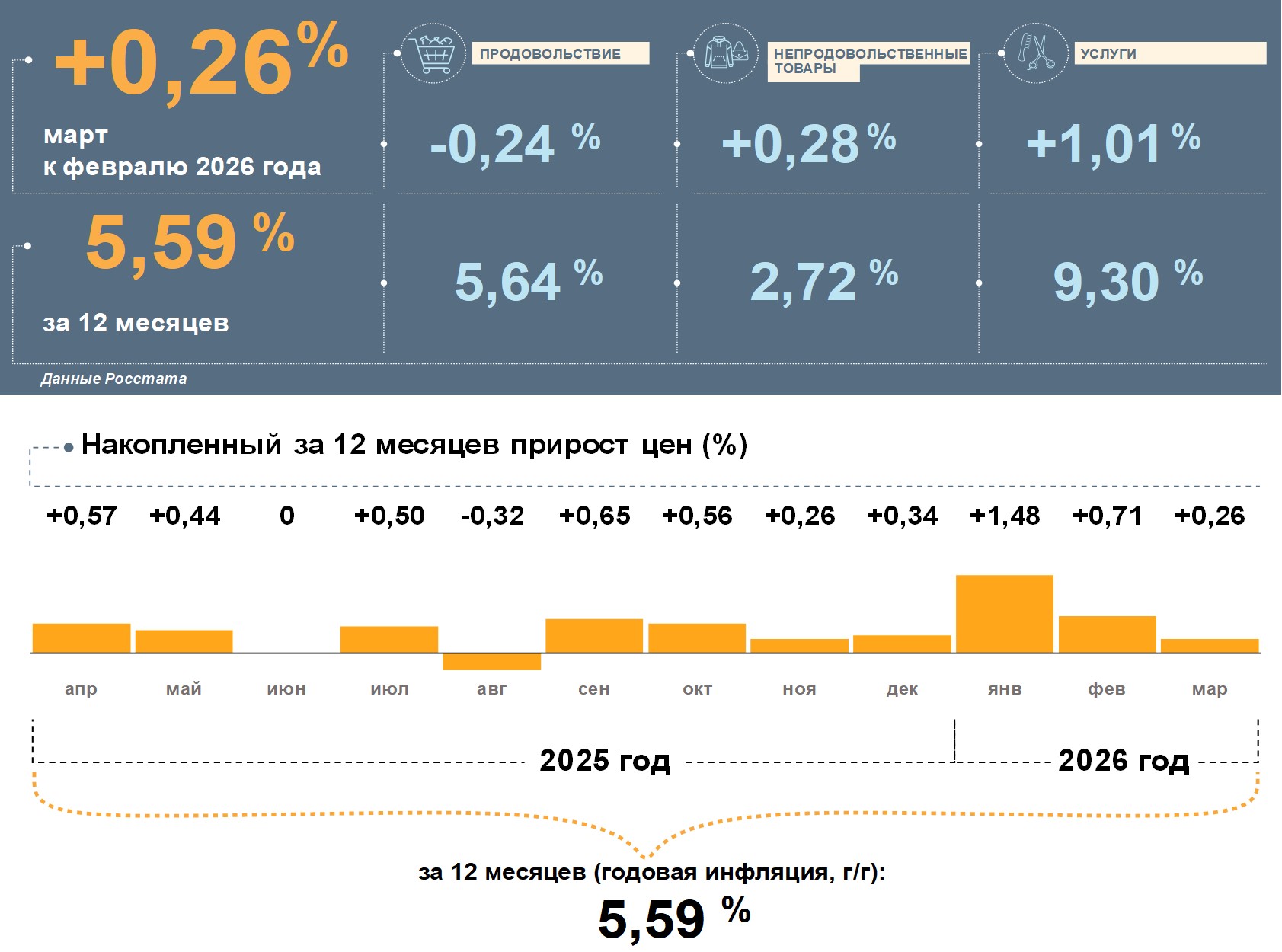 По данным Росстата, в марте 2026 года цены в Ростовской области выросли на 0,26% к предыдущему месяцу. Годовая инфляция замедлилась до 5,59% и стала ниже показателя в целом по стране (5,86%).