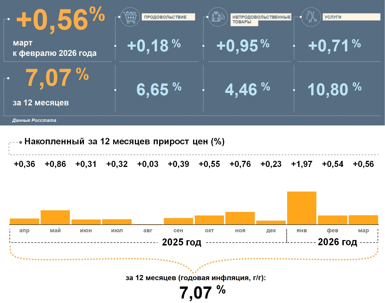Цены в Новгородской области в марте 2026 года, по данным Росстата, выросли на 0,56% к февралю. Годовая инфляция не изменилась и составила 7,07%. Это выше, чем в целом по стране (5,86%).