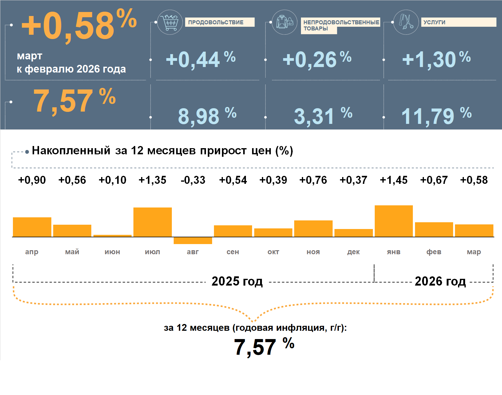 Цены в Республике Бурятия в марте 2026 года, по данным Росстата, выросли на 0,58% к февралю 2026 года. Годовая инфляция замедлилась и составила 7,57%. Это выше, чем в целом по стране (5,86%).