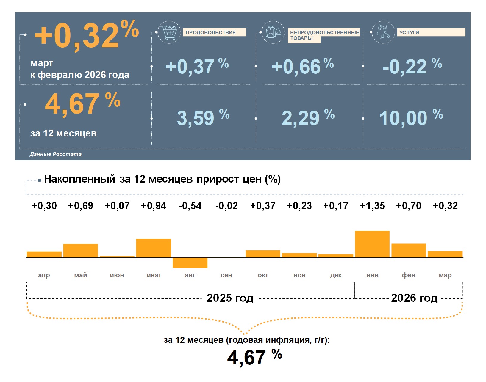 Цены в Тюменской области (без учета автономных округов) в марте 2026 года, по данным Росстата, выросли на 0,32% к февралю. Годовая инфляция замедлилась и составила 4,67%. Это ниже, чем в целом по стране (5,86%).