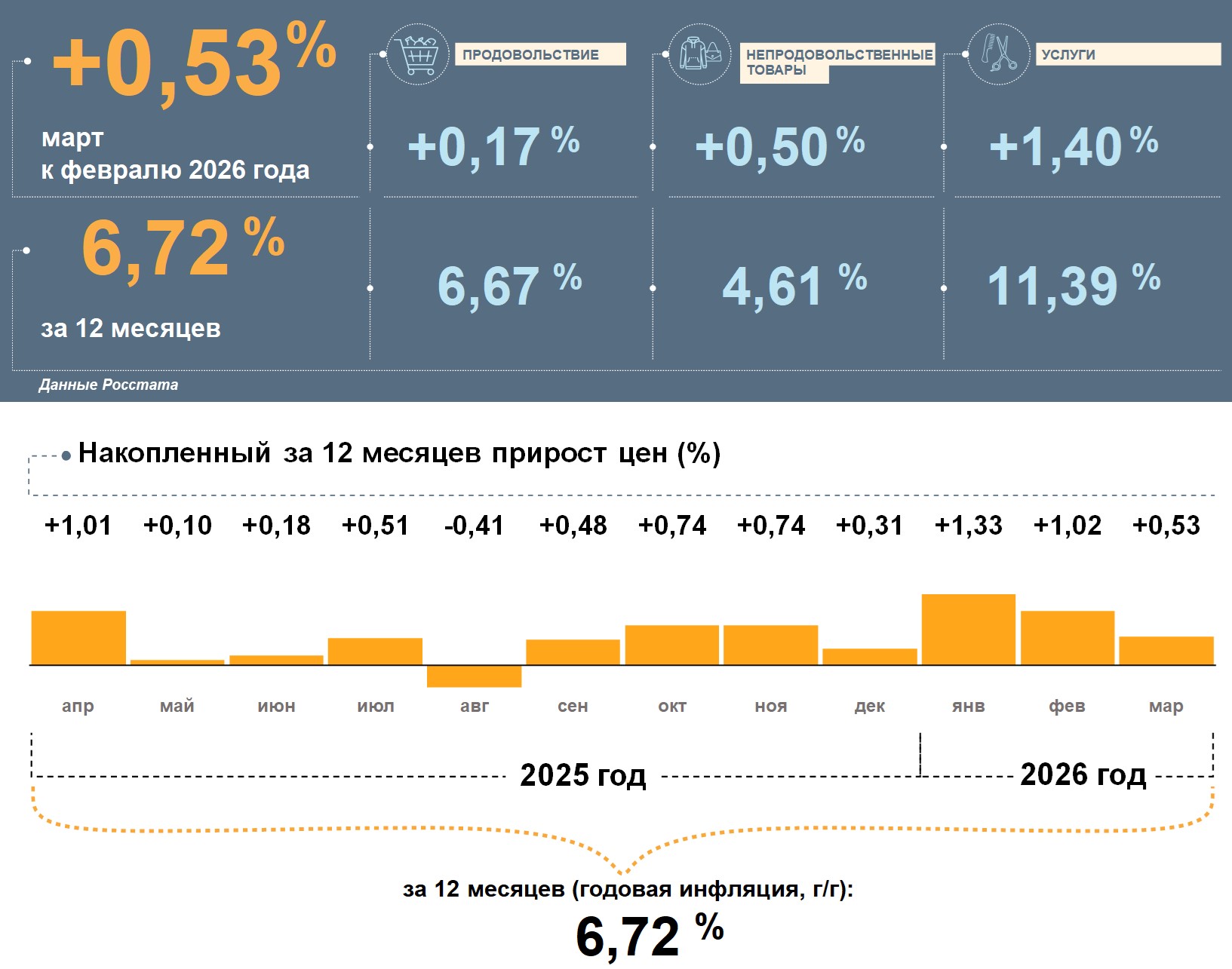 Цены в Курганской области в марте 2026 года, по данным Росстата, выросли на 0,53% к февралю. Годовая инфляция увеличилась и составила 6,72%. Это выше, чем в целом по стране (5,86%).