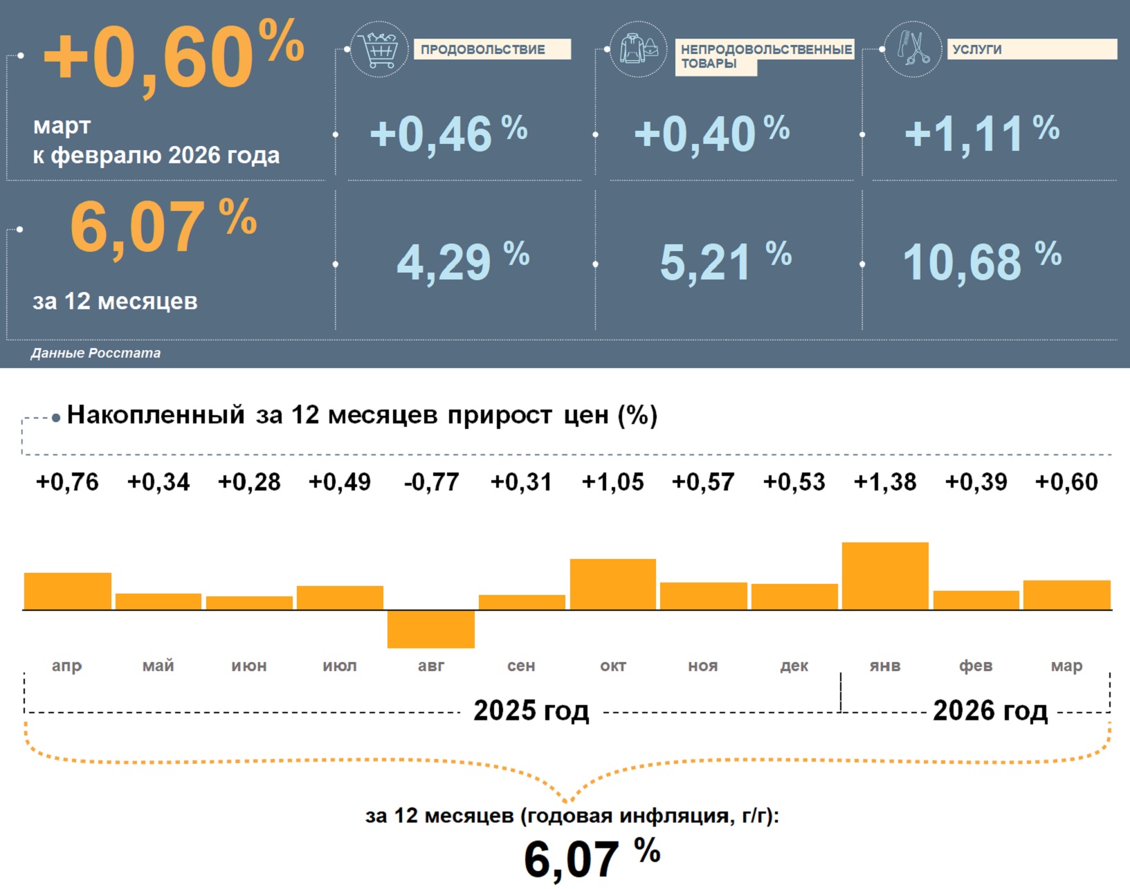 Цены в Саратовской области в марте 2026 года, по данным Росстата, выросли на 0,60% к февралю. Годовая инфляция осталась на том же уровне и составила 6,07%, что выше, чем в целом по стране (5,86%).