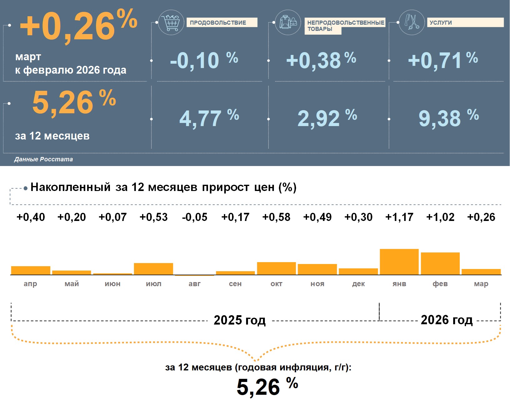 Цены в Ивановской области в марте 2026 года, по данным Росстата, выросли на 0,26% к февралю. Годовая инфляция замедлилась и составила 5,26%. Это ниже, чем в целом по стране (5,86%).