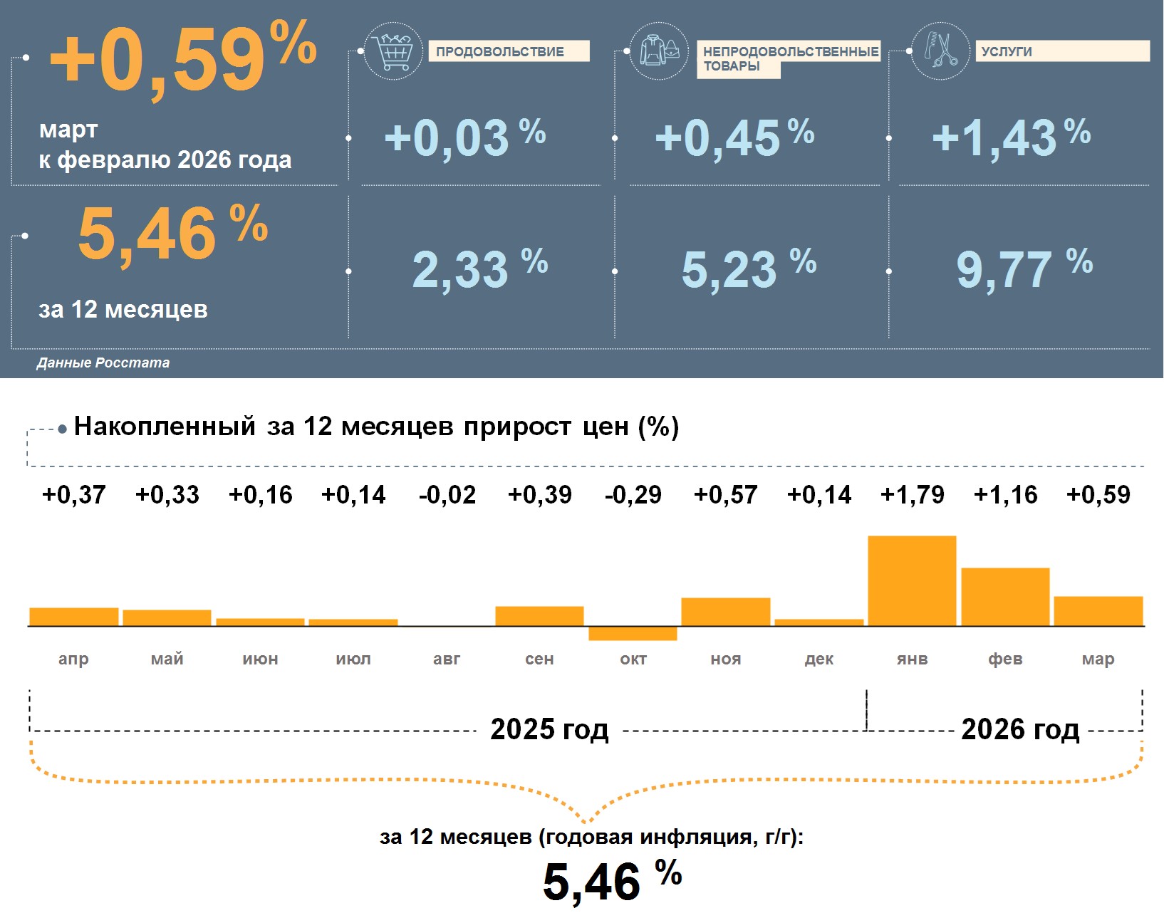 Цены в Санкт-Петербурге в марте 2026 года, по данным Росстата, выросли на 0,59% к февралю. Годовая инфляция замедлилась и составила 5,46%. Это ниже, чем в целом по стране (5,86%).