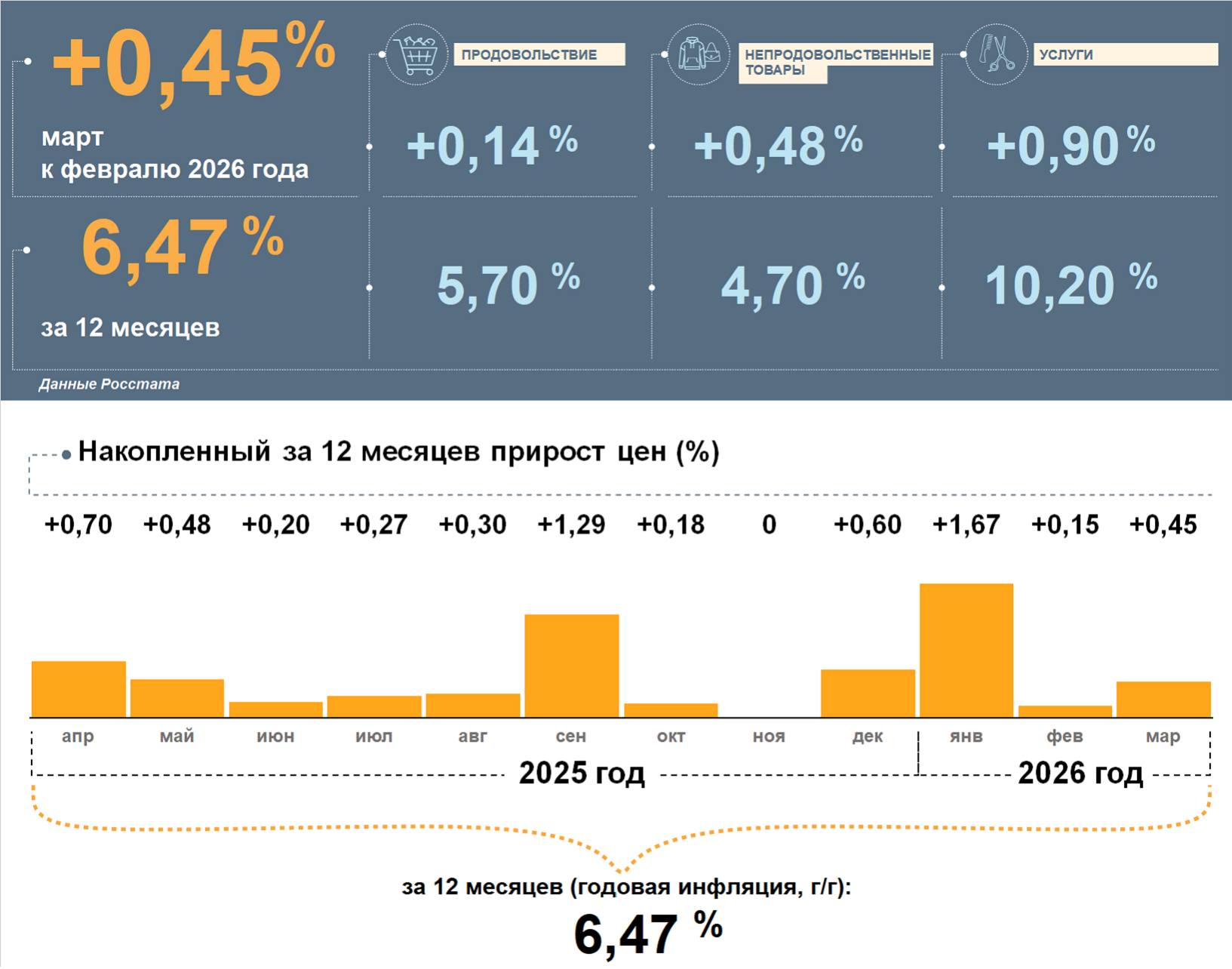 Значительнее всего в марте 2026 года и в целом за год повысилась стоимость услуг. Годовой прирост цен на них оставался выше, чем по потребительской корзине в целом. Продовольственные и непродовольственные товары также подорожали. Однако за год цены на них выросли меньше, чем на все товары и услуги.