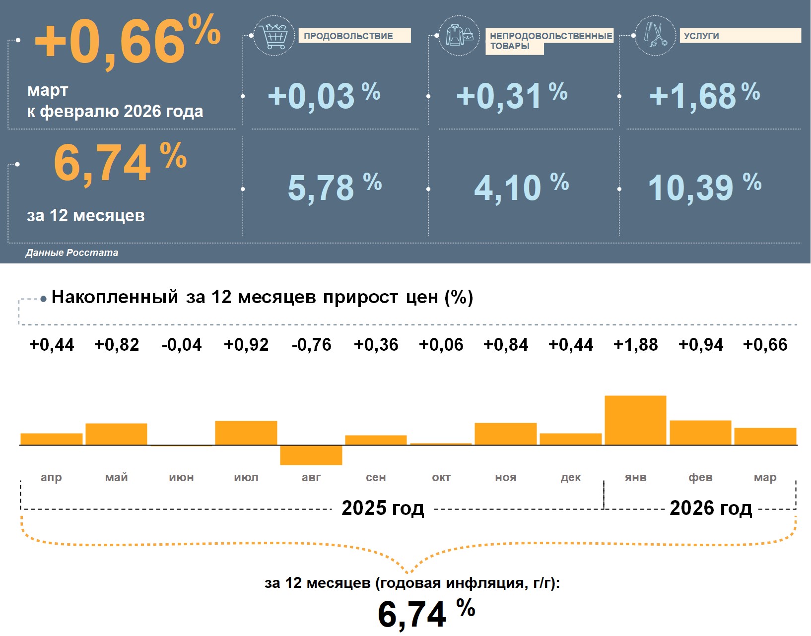 Цены в Ярославской области в марте 2026 года, по данным Росстата, выросли на 0,66% к февралю. Годовая инфляция замедлилась и составила 6,74%. Это выше, чем в целом по стране (5,86%).