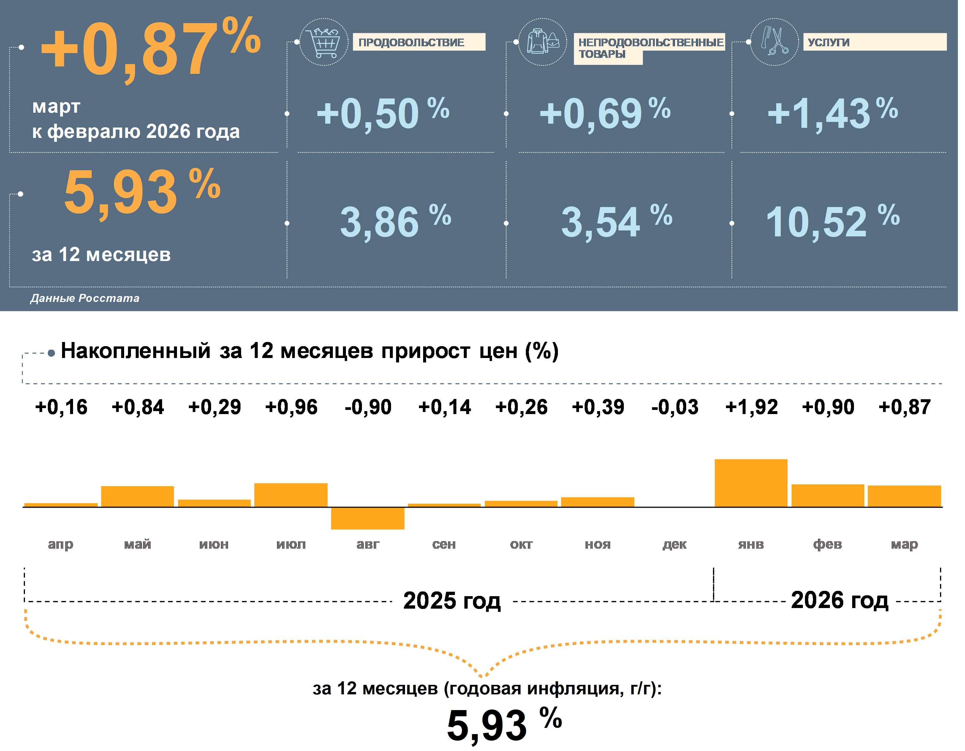 Цены в Московской области в марте 2026 года, по данным Росстата, выросли на 0,87% к февралю. Годовая инфляция ускорилась и составила 5,93%, это выше, чем в целом по стране (5,86%).