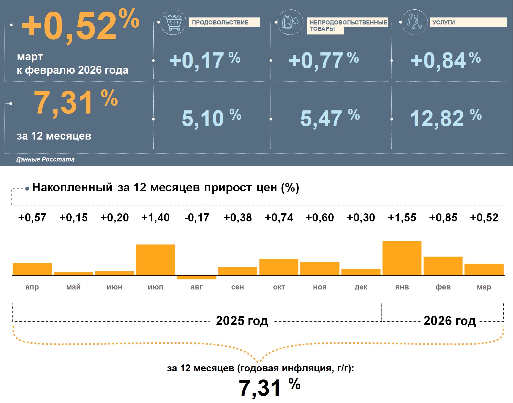 Цены в Рязанской области в марте 2026 года, по данным Росстата, выросли на 0,52% к февралю. Годовая инфляция увеличилась и составила 7,31%. Это выше, чем в целом по стране (5,86%).