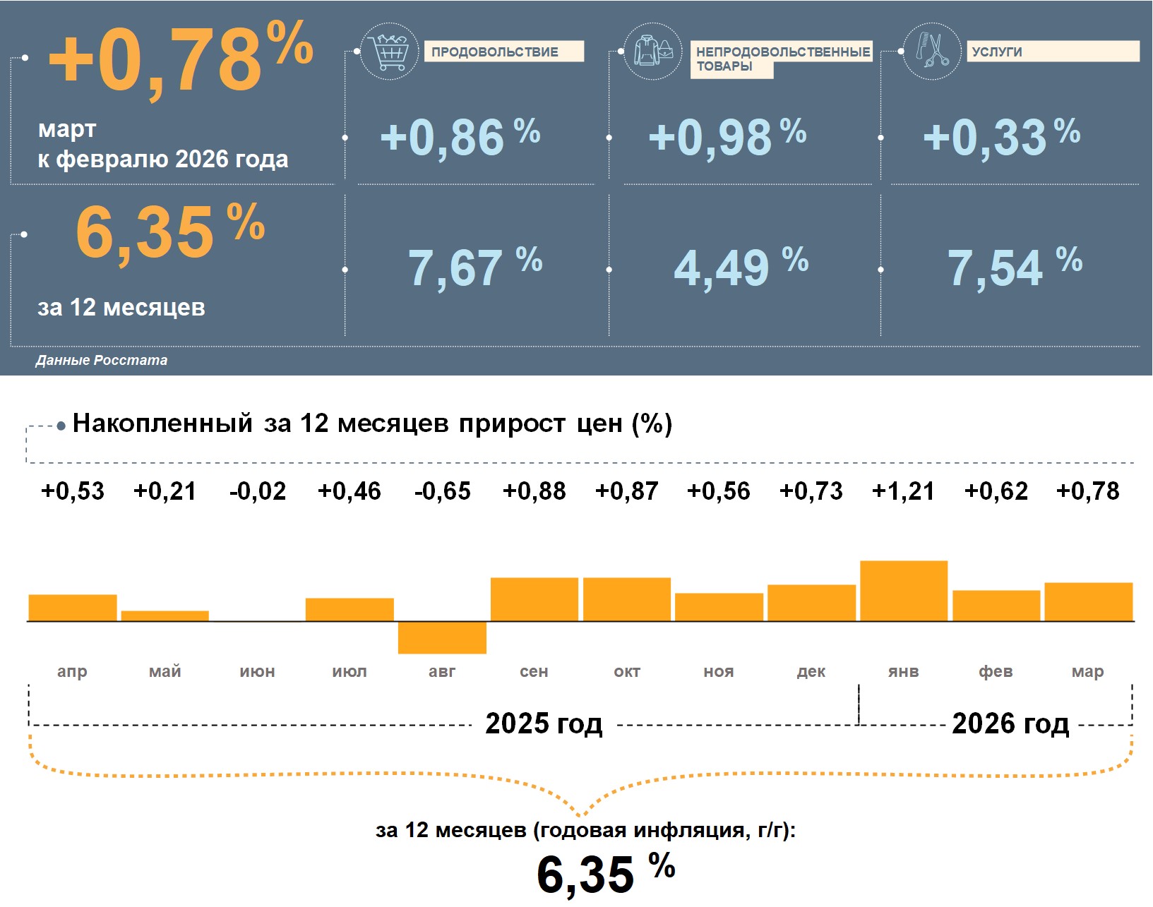 Цены в Карачаево-Черкесской Республике в марте 2026 года, по данным Росстата, выросли на 0,78% к февралю. Годовая инфляция ускорилась до 6,35%. Это выше, чем в целом по стране (5,86%).