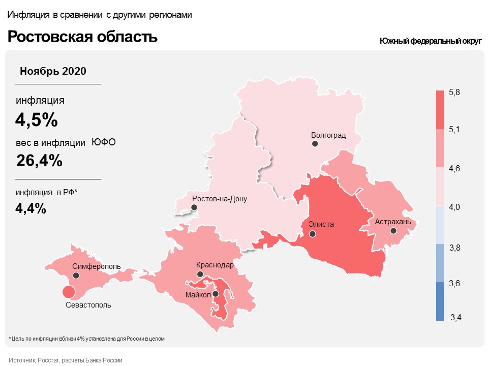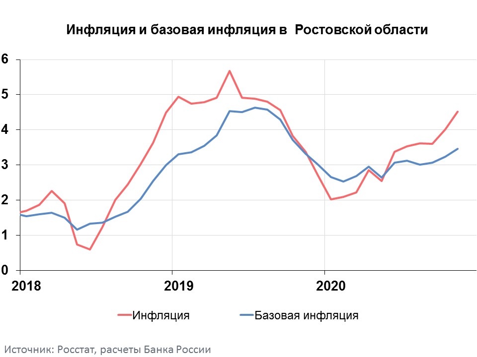 В ноябре 2020 года годовая инфляция в донском регионе увеличилась до 4,5% с 4,0% в октябре, что сопоставимо с общероссийским показателем (4,4%) и ниже уровня по Южному федеральному округу в целом (4,7%). Существенное проинфляционное влияние оказало снижение предложения отдельных агрокультур, а также такие общефедеральные факторы, как ослабление рубля и рост мировых цен на зерно. Локальным фактором ускорения инфляции стала индексация тарифов на содержание и ремонт муниципального и государственного жилья в Ростове-на-Дону.