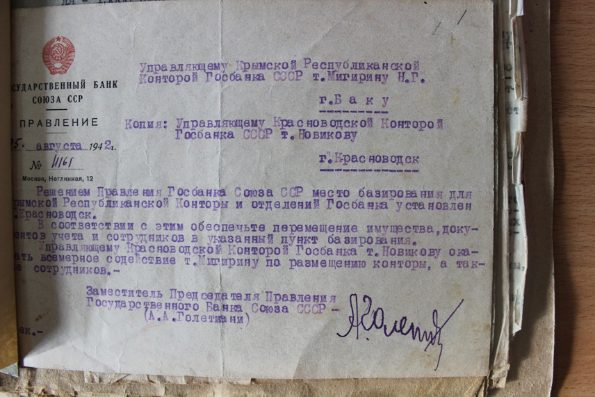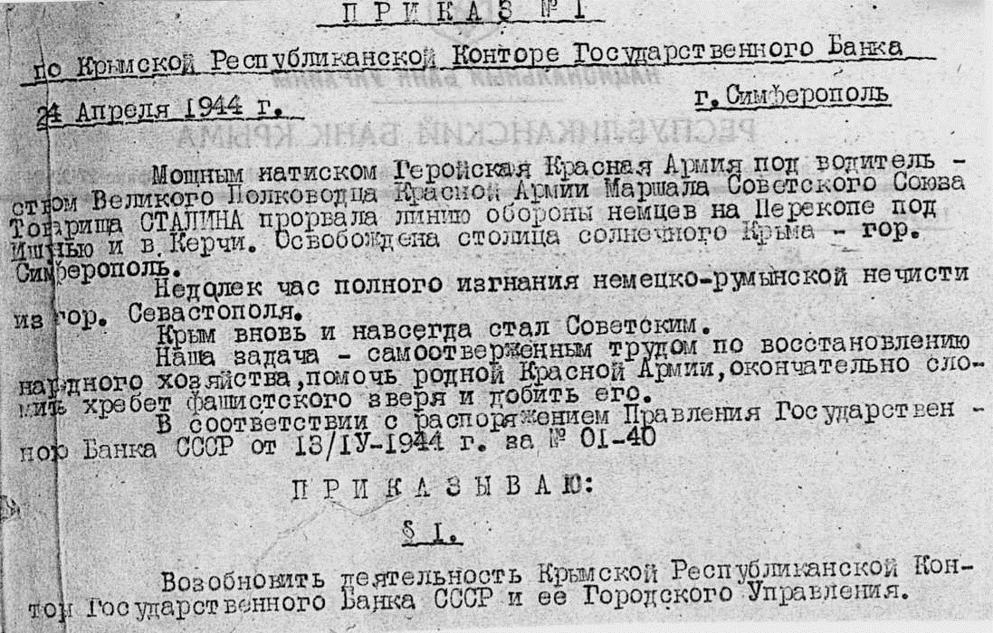 В рекордно-короткий срок восстанавливалась деятельность конторы после освобождения Крыма от немецко-фашистских захватчиков: к обслуживанию народного хозяйства в Крыму приступили городское управление и 22 отделения Госбанка, осуществляя финансирование всех отраслей промышленности и сельского хозяйства, строительства городов в республике, выдачу долгосрочных и краткосрочных кредитов, а также кассовое обслуживание.